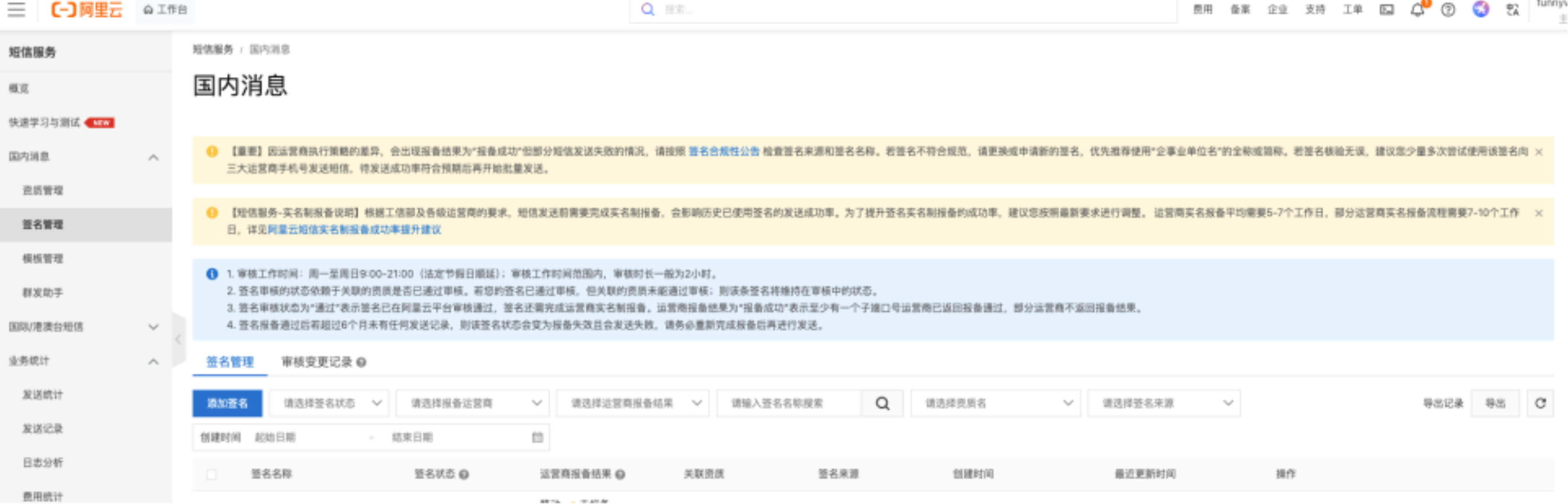 1)在「 国内消息 >> 短信服务 >> 国内文本短信 >> 签名管理」处,点击「添加签名」。