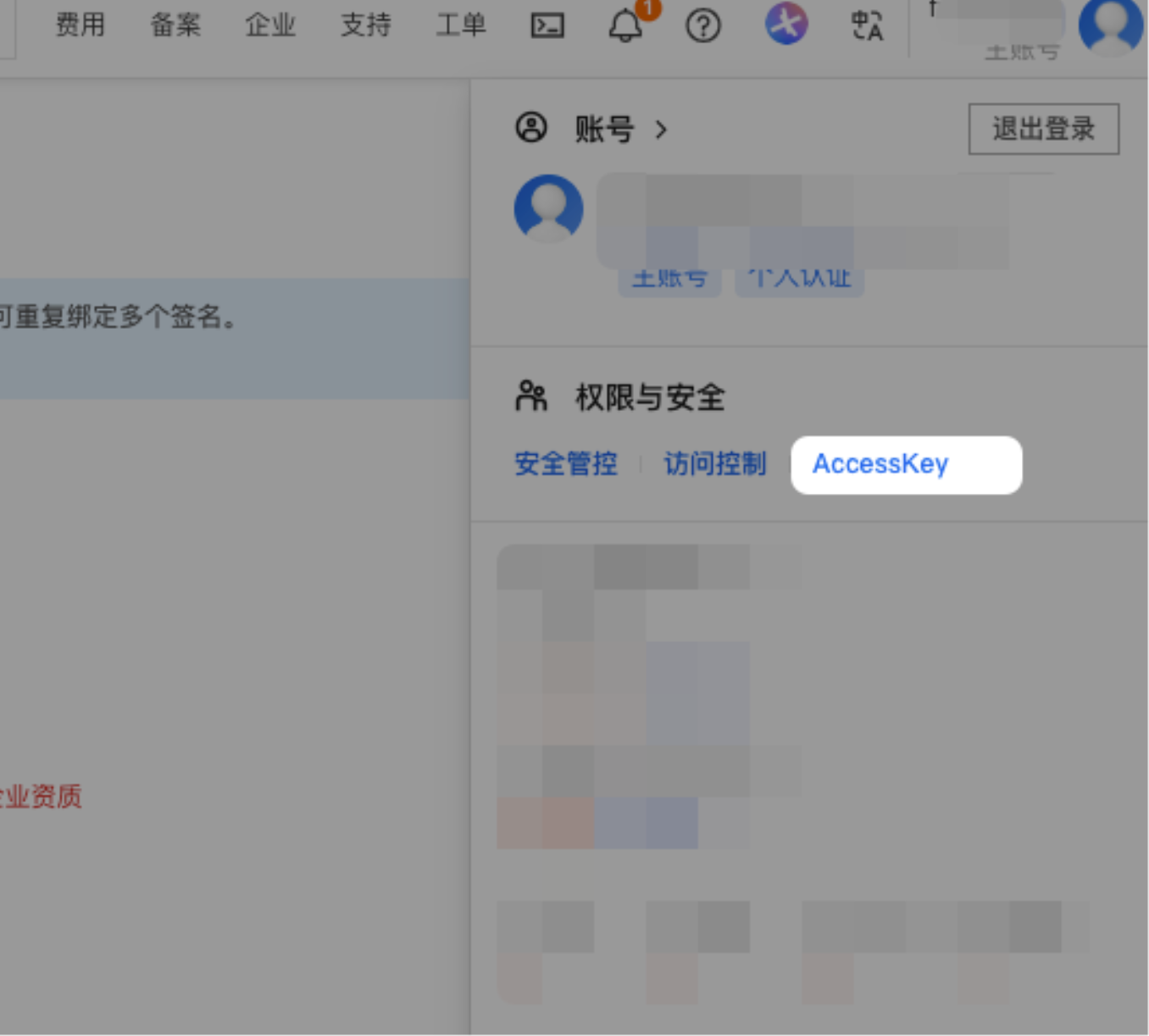 2)进入控制台后,点击右上角「账户中心 >>AccessKey 管理」,在弹出的安全提示页面中,选择「继续使用 AccessKey」。
