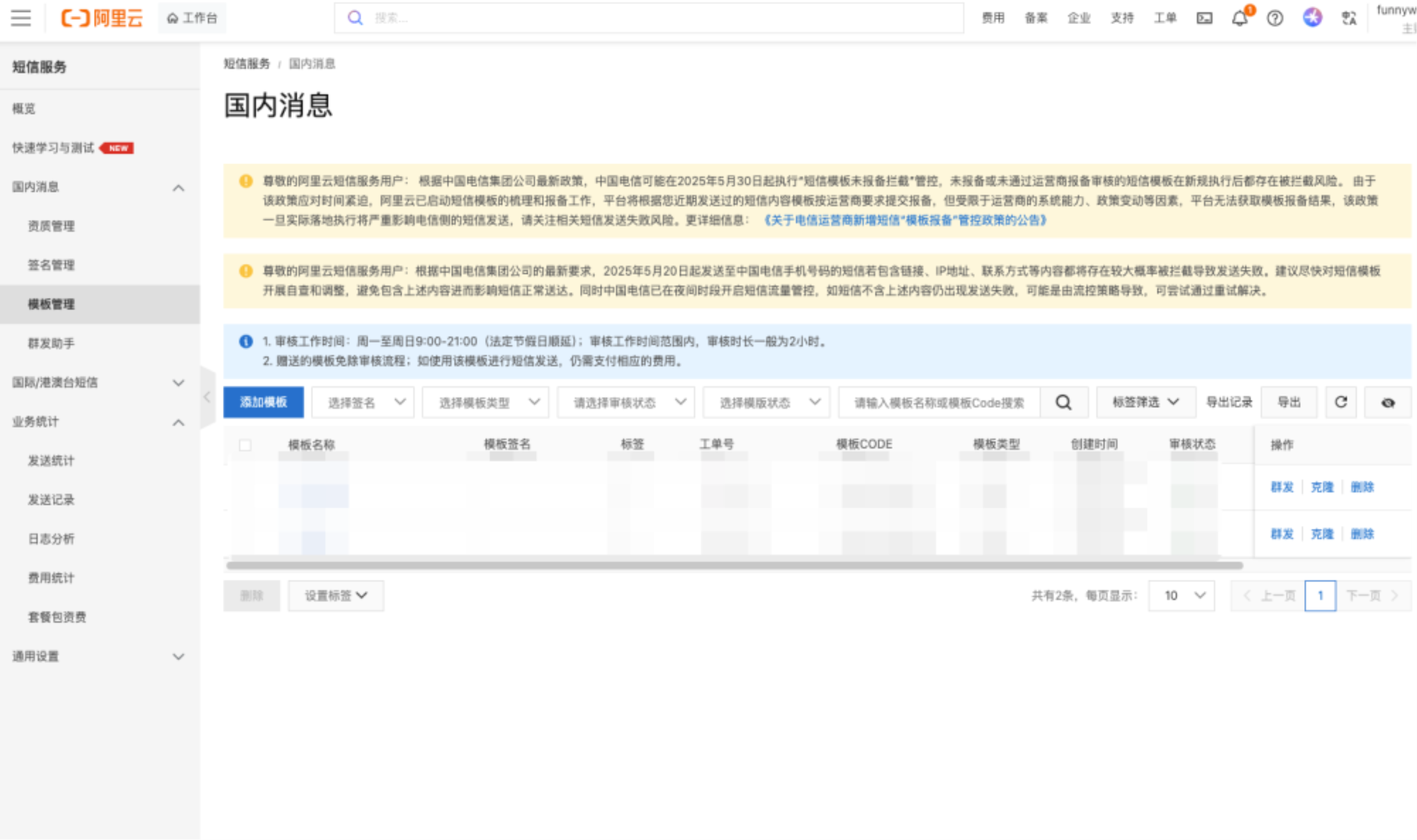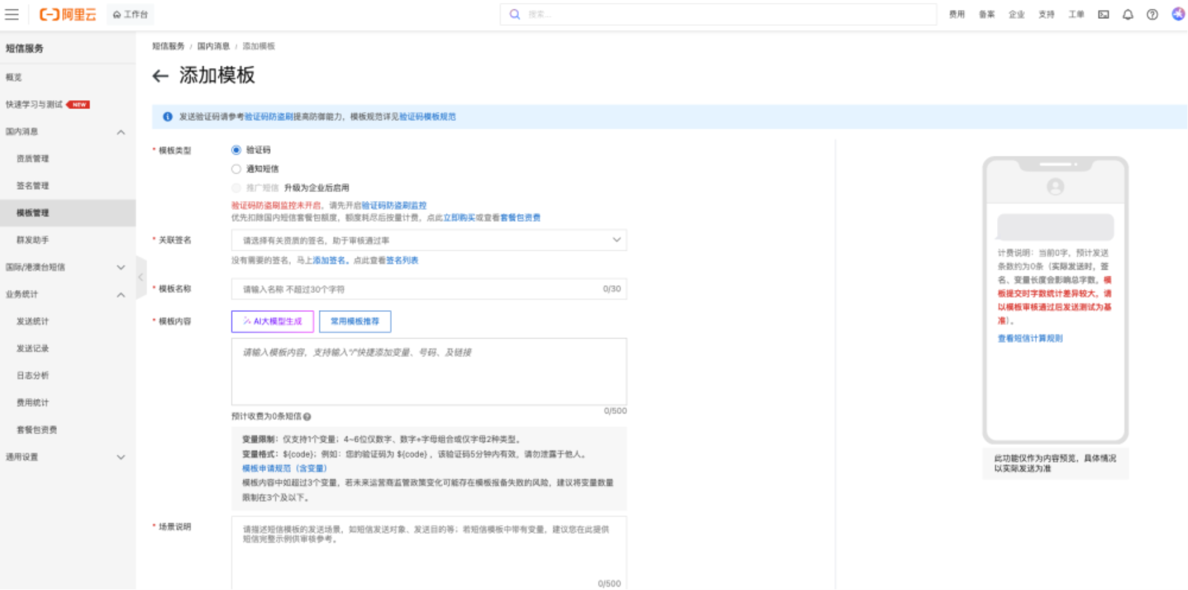 注:短信模板详细设置可参见阿里云文档:短信模板规范。