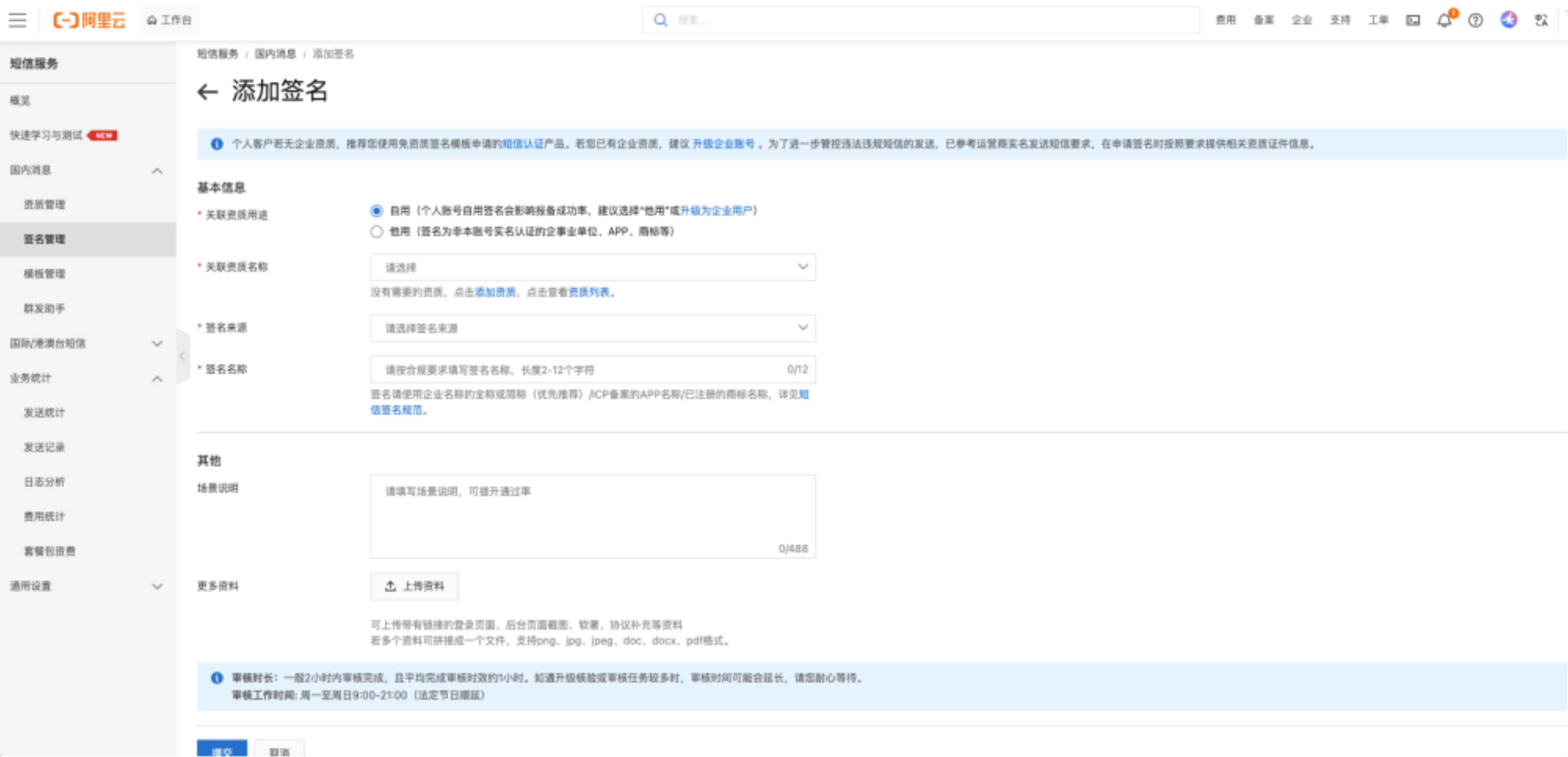 2)在「添加签名」页面中,根据企业需求选择并设置对应内容,如签名、适用场景、签名用途、签名来源等。