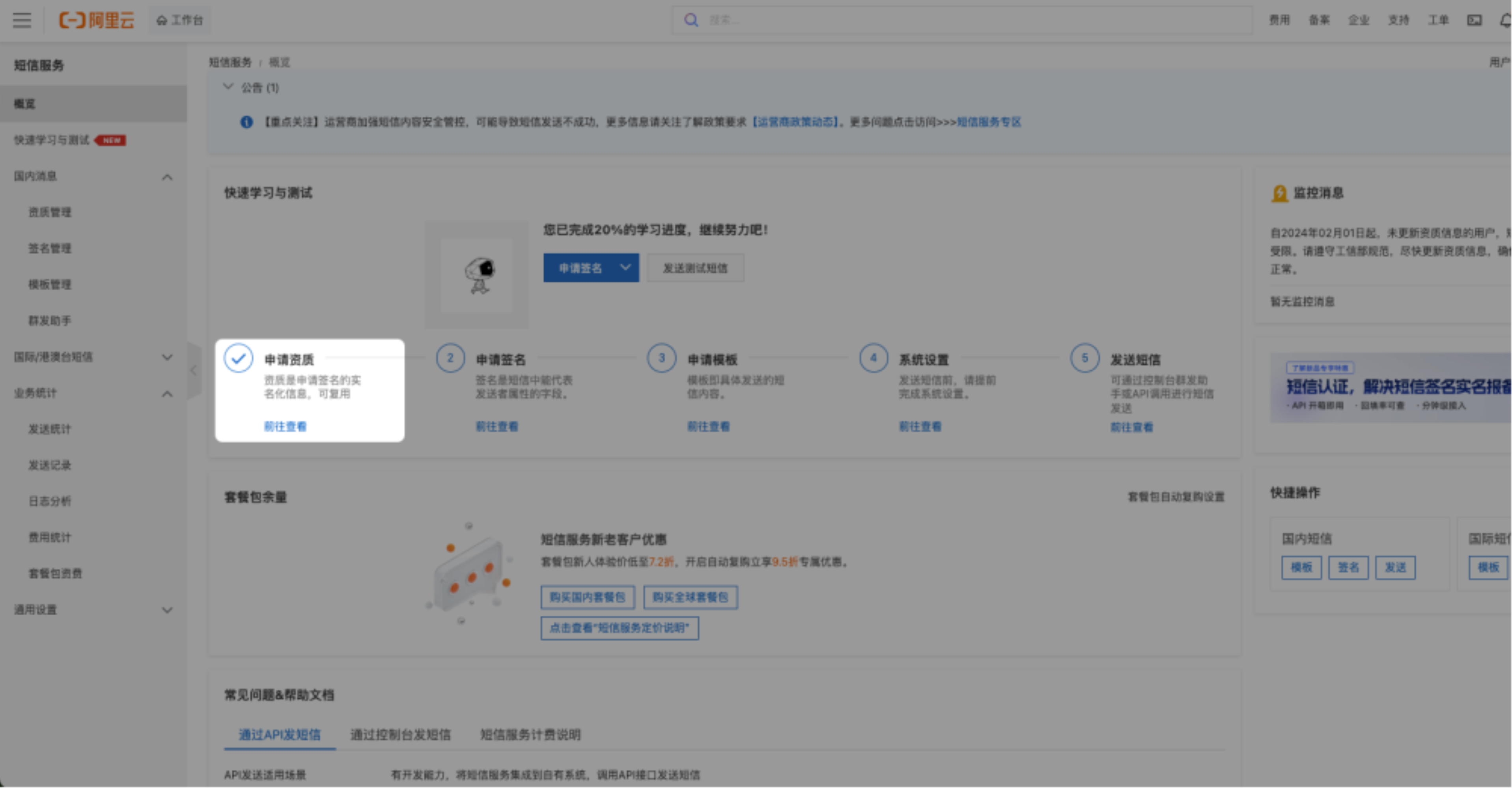 1)在阿里云工作台中,搜索并进入「短信服务」