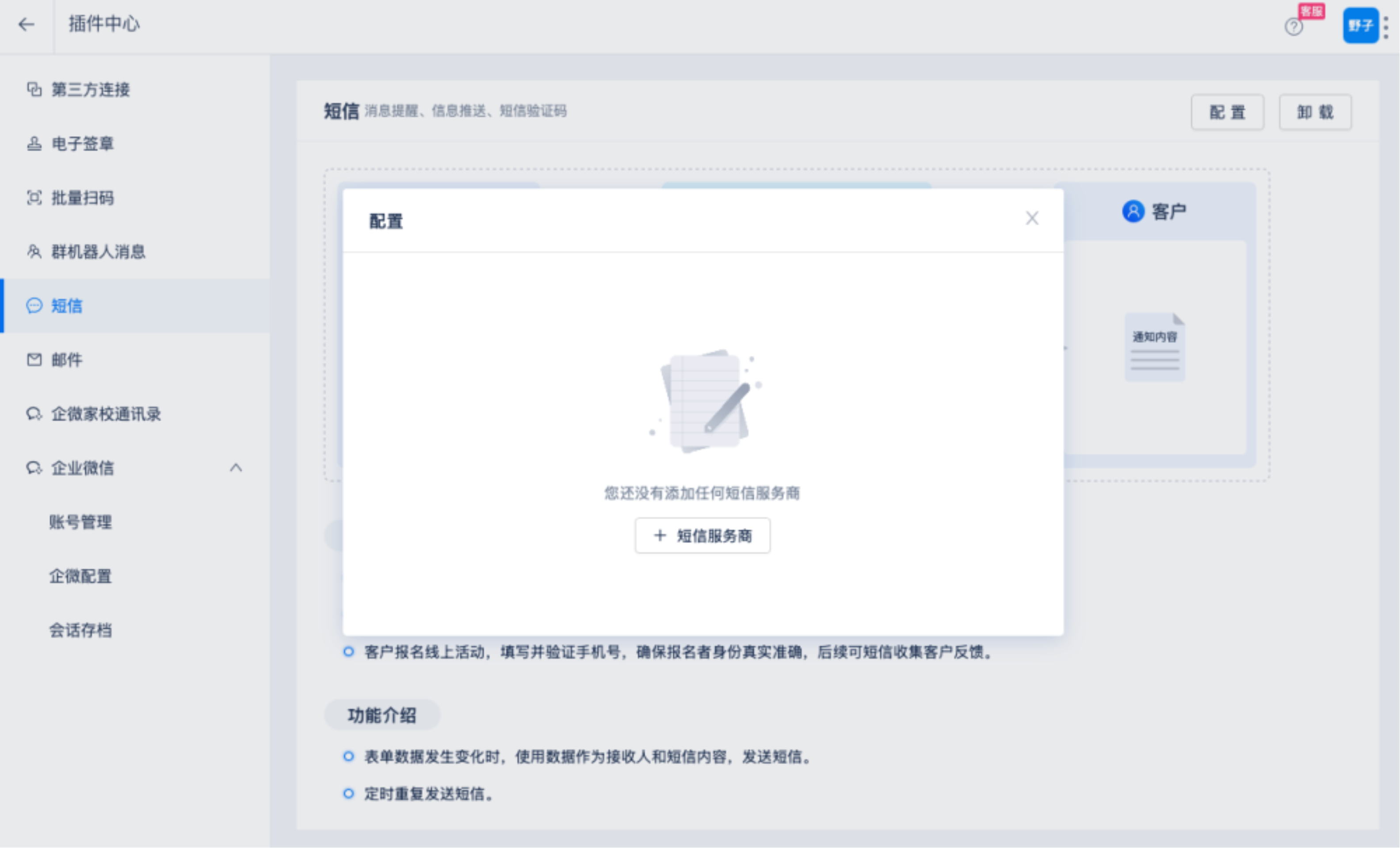 在插件中心,安装插件后,需配置短信平台的配置信息