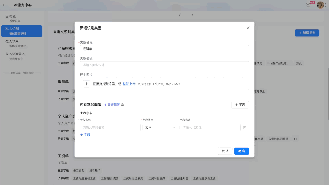 字段,且必须填写字段名称和字段类型;样本图片仅支持上传 1 张,大小不超过 5MB。