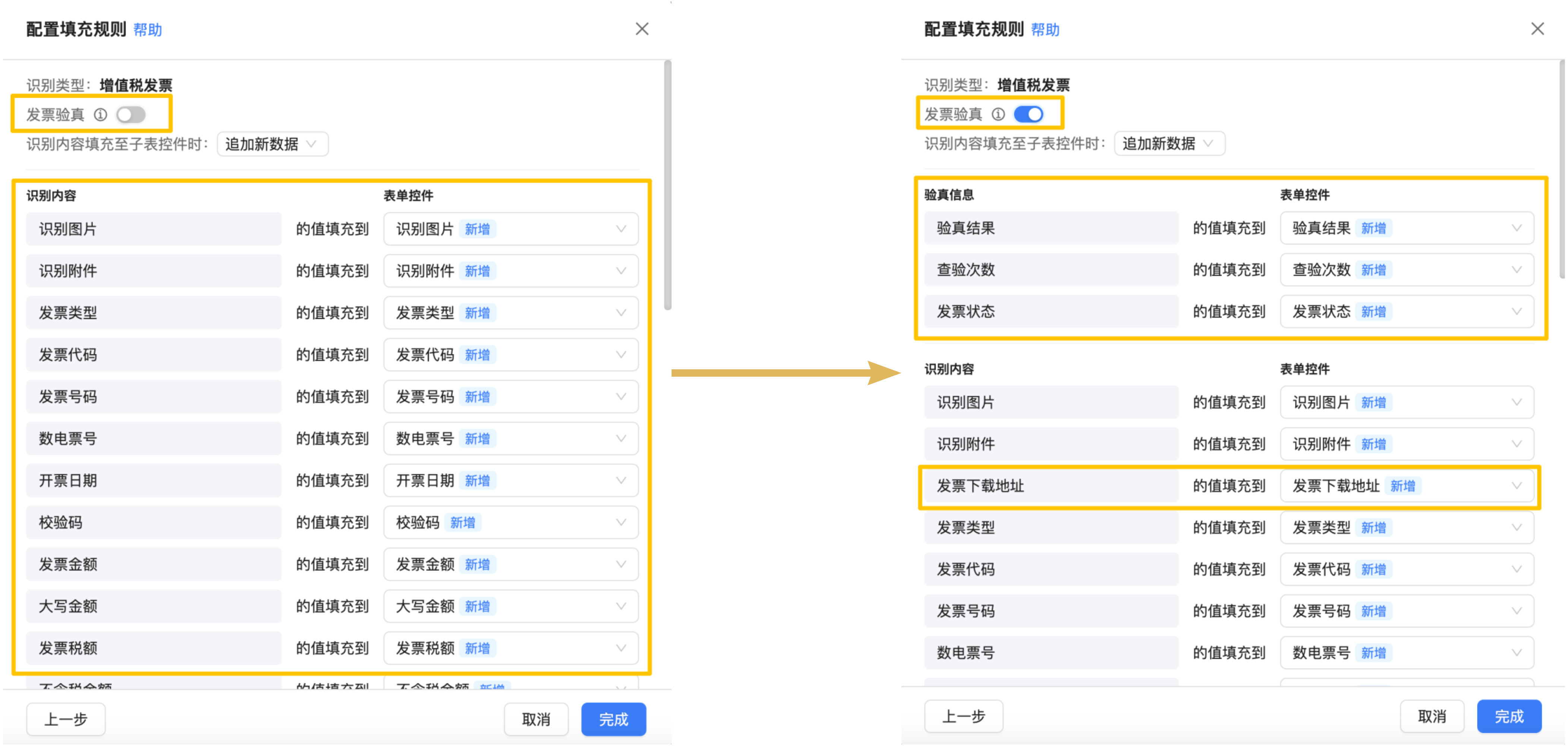 识别类型为增值税发票、或在智能财务票据识别中识别文件类型为增值税发票时,支持开启发票验真。开启