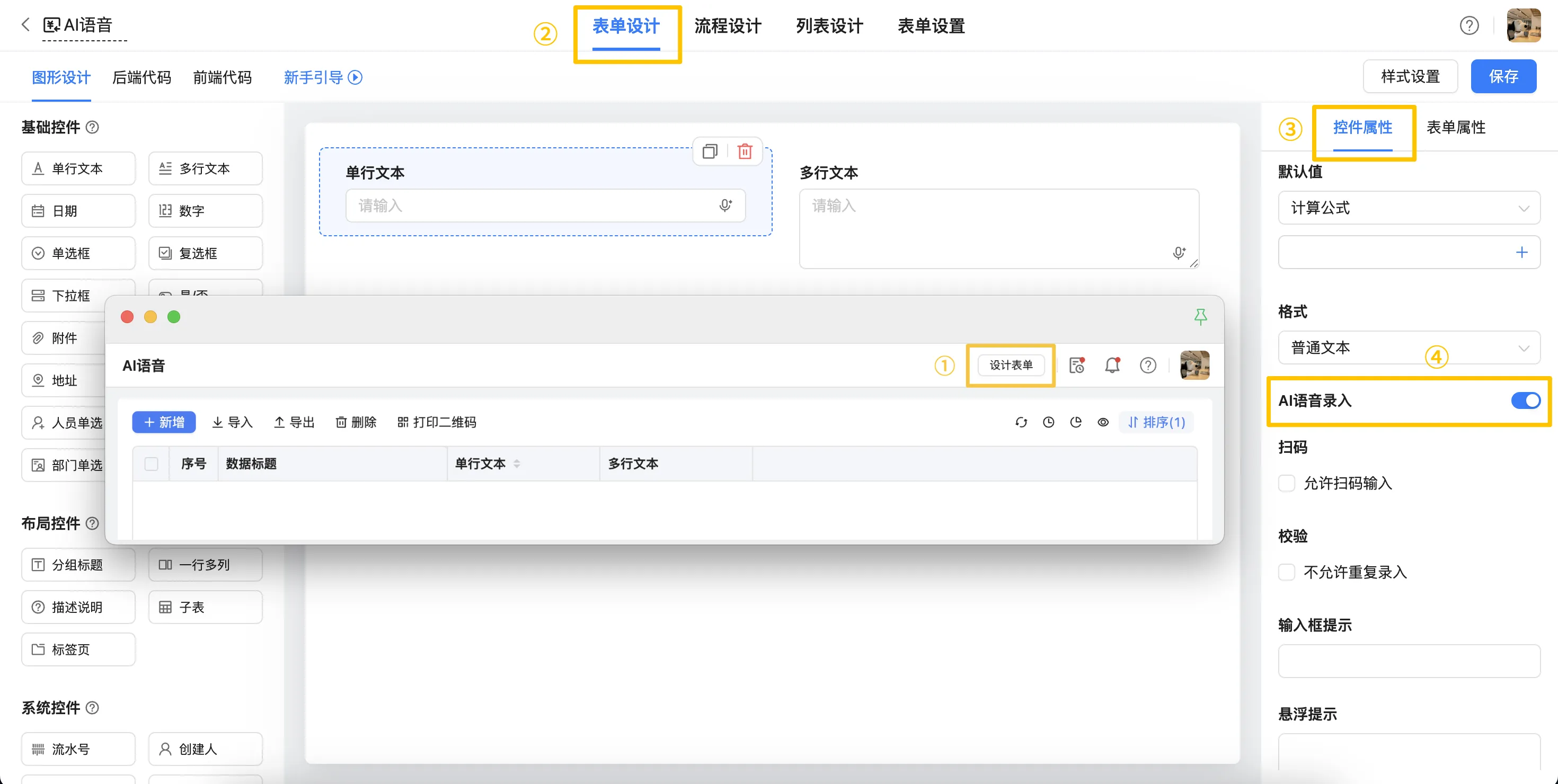 目前仅单行文本和多行文本控件支持开启AI语音录入功能。开启AI语音录入开关后,字段右侧将显示 “麦克风图标”,表示该字段已支持语音输入。