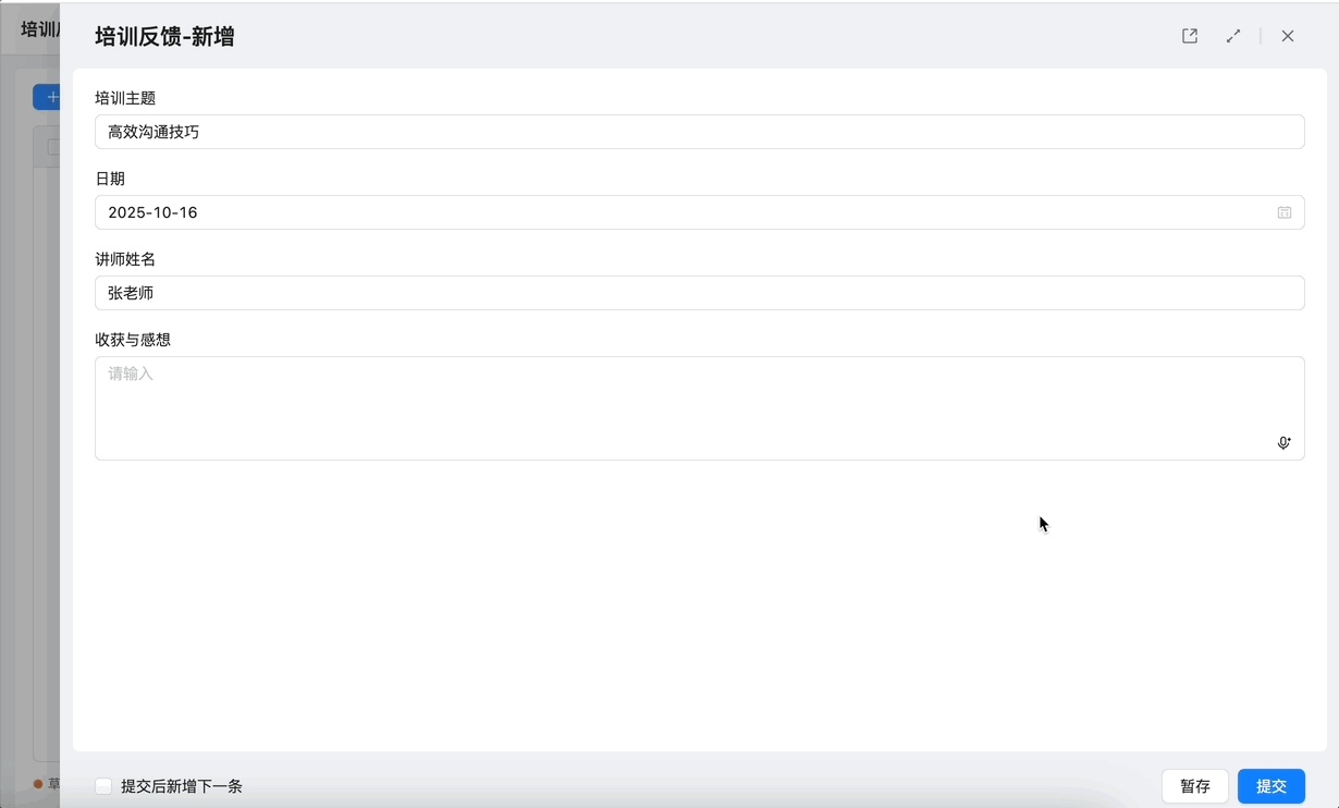 培训反馈整理:员工在填写培训反馈时可通过语音表达体验感受,系统自动识别并录入满意度调查表。