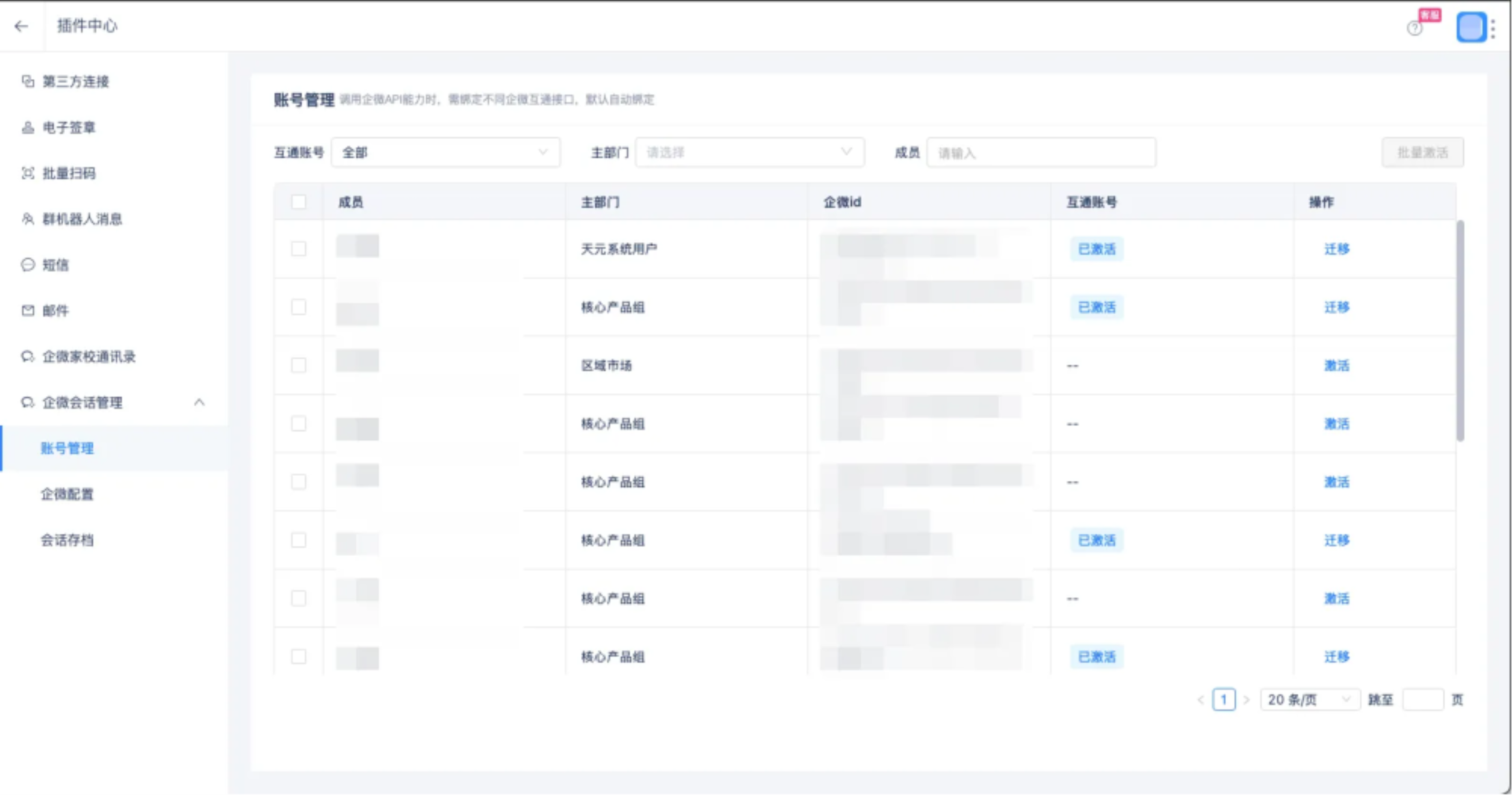 系统管理员可至「氚云平台-插件中心-企业微信-账号管理」菜单下,对已激活人员进行迁移操作。
