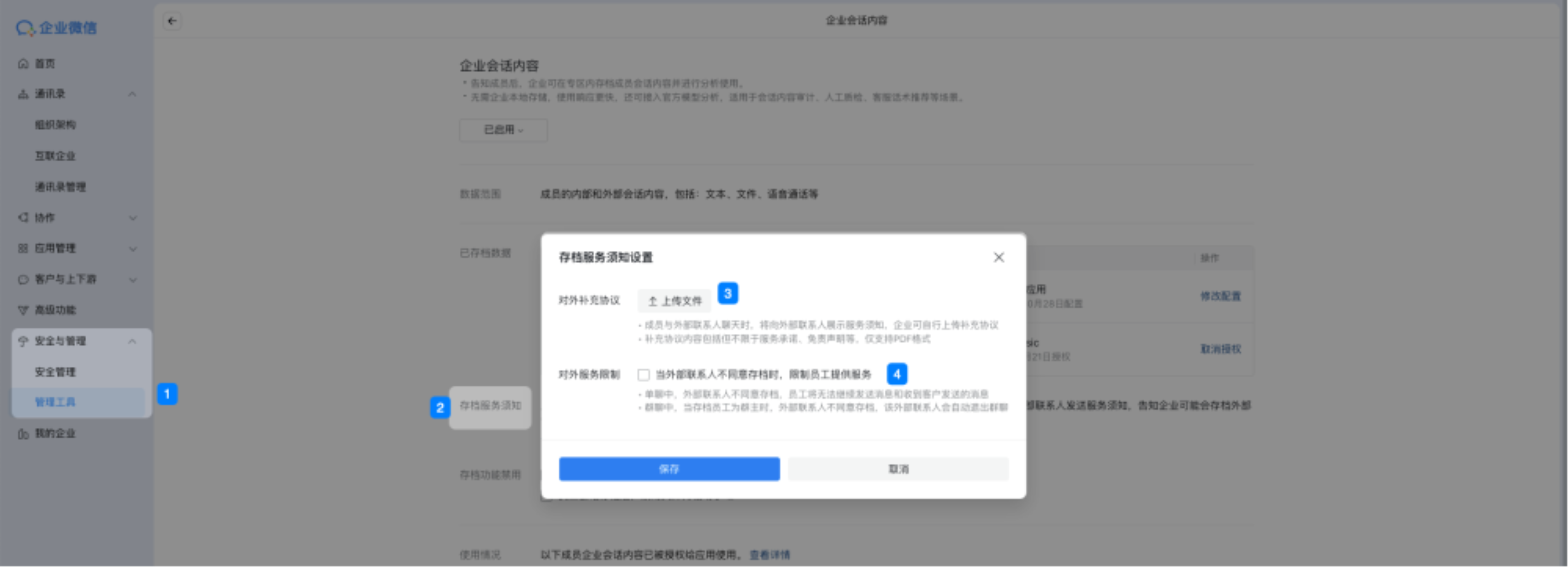 当客户「不同意存档」,企微管理员可以在「企微管理后台-管理工具-数据智能专区-企业会话内容-存档服务须知」中,设置对外服务限制,默认不开启限制。