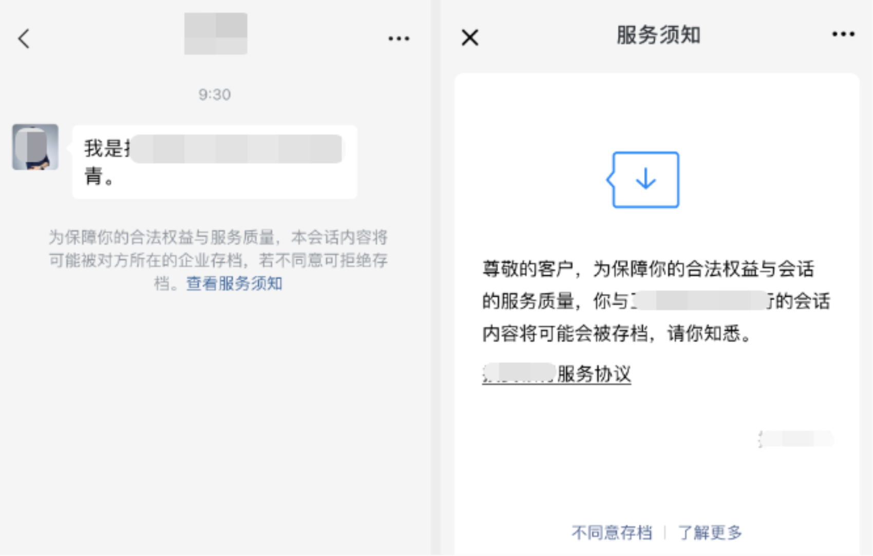 客户:存档范围内的员工与客户沟通时,客户聊天框会提示会话内容存档提醒,默认静默同意,企业可通过API获取存档成员的客户服务会话内容;客户可不同意存档,不同意存档的会话无法记录和查看。