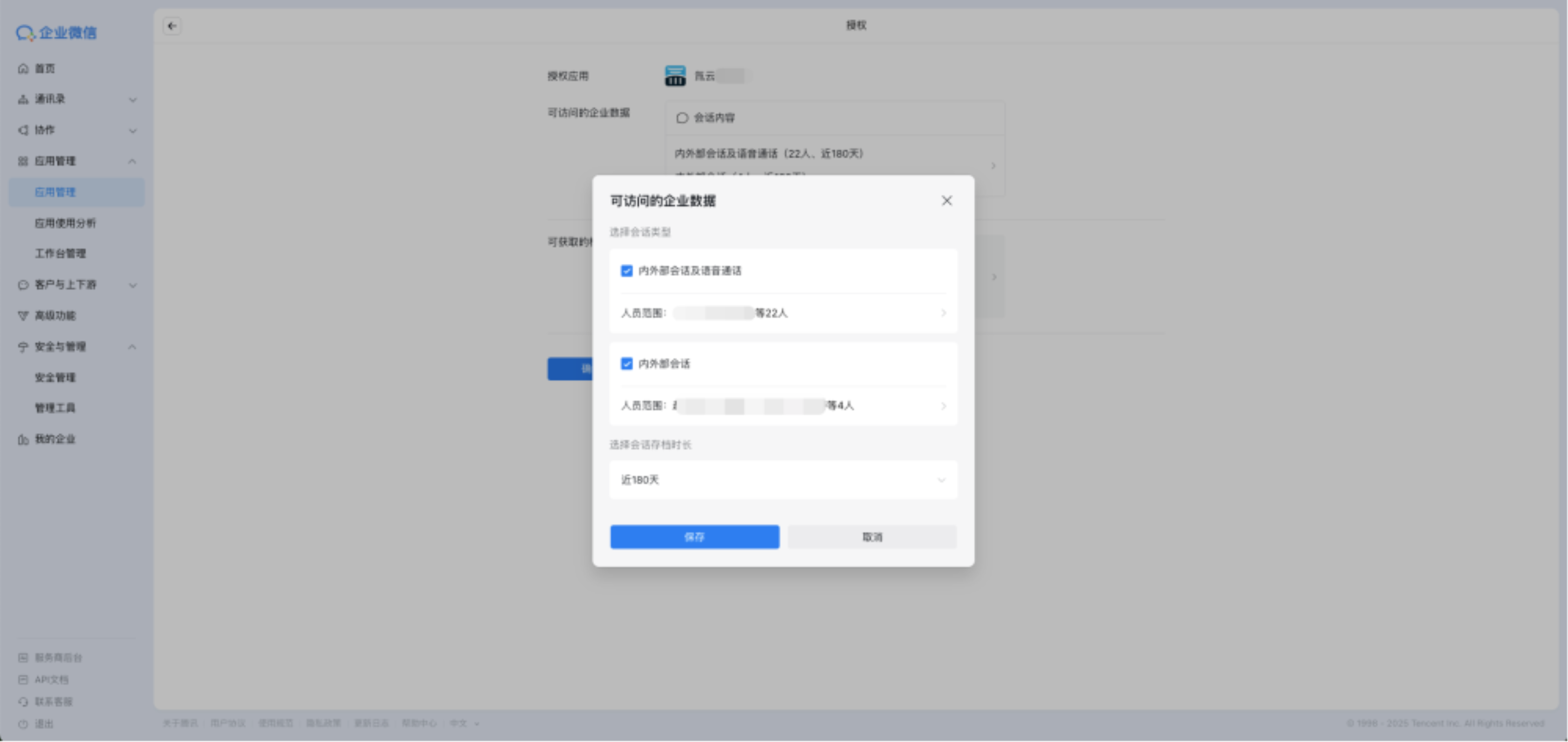 员工:企微管理后台中配置的存档人员,当存档人员有变更时,请及时调整。可至「企微管理后台-应用管理-氚云应用-授权信息-数据与智能专区」查看。