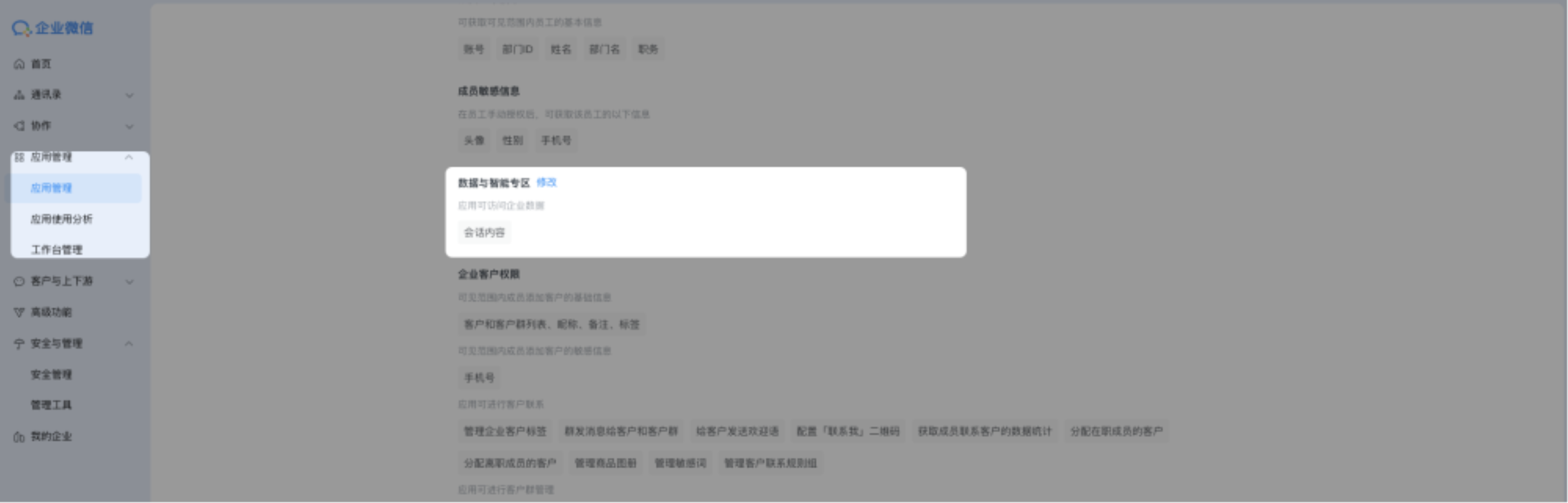 答:可至「企微管理后台-应用管理-氚云应用-授权信息-数据与智能专区」查看调整。