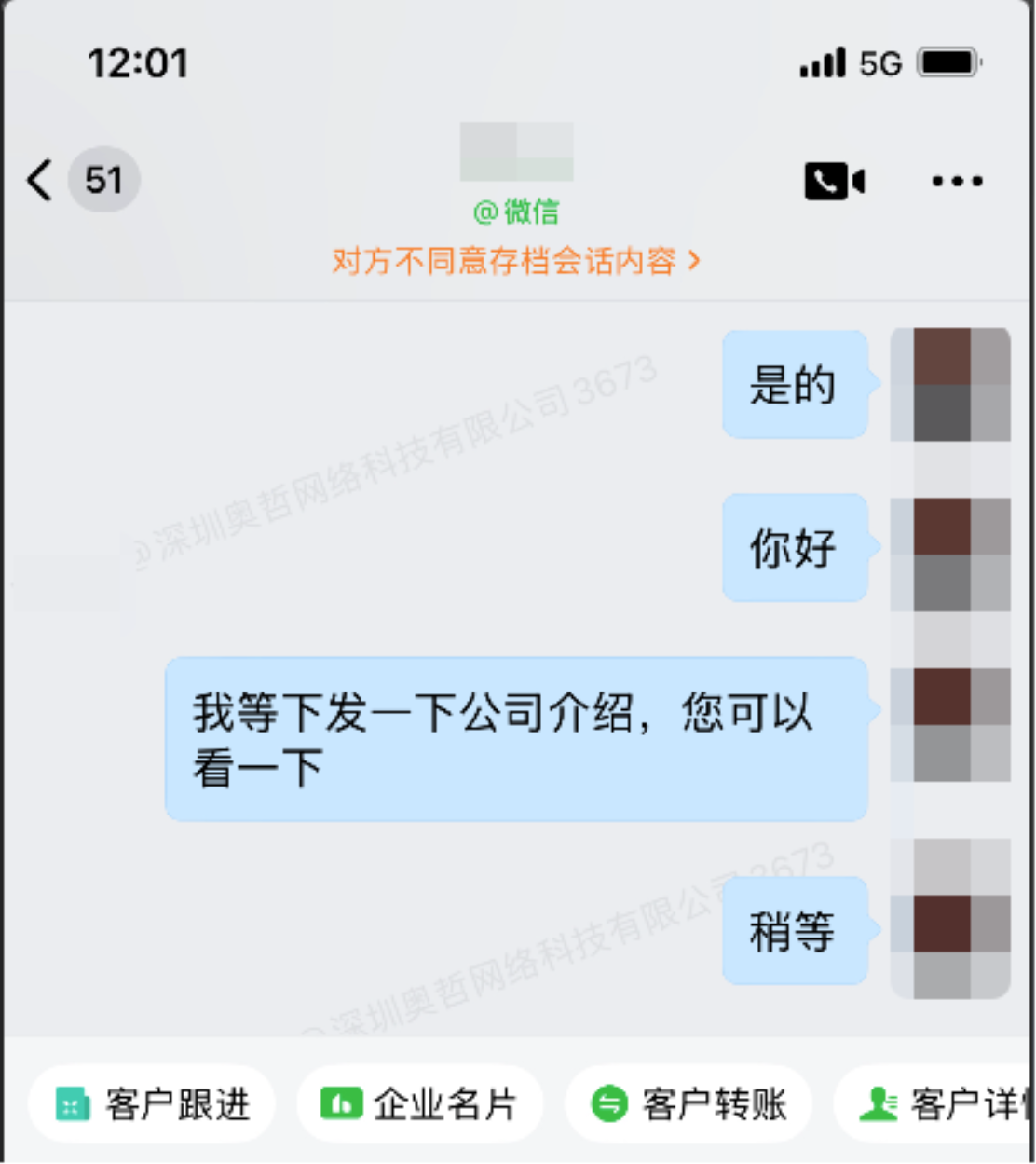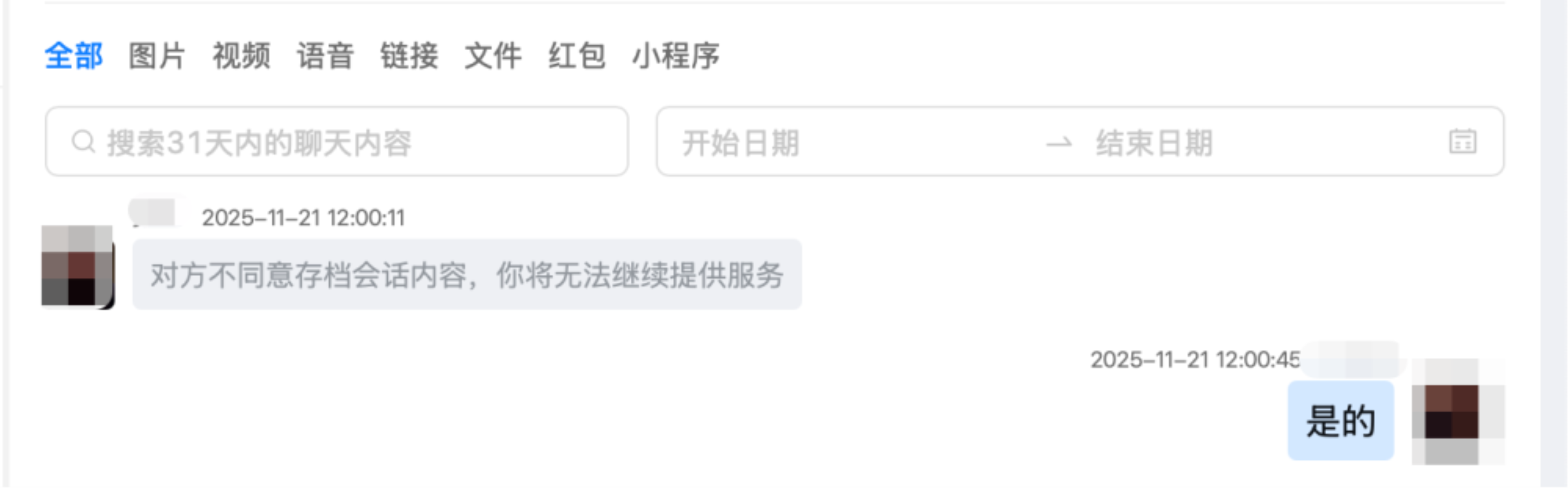 • 单聊中,外部联系人不同意存档,员工将无法继续发送消息和收到客户发送的消息