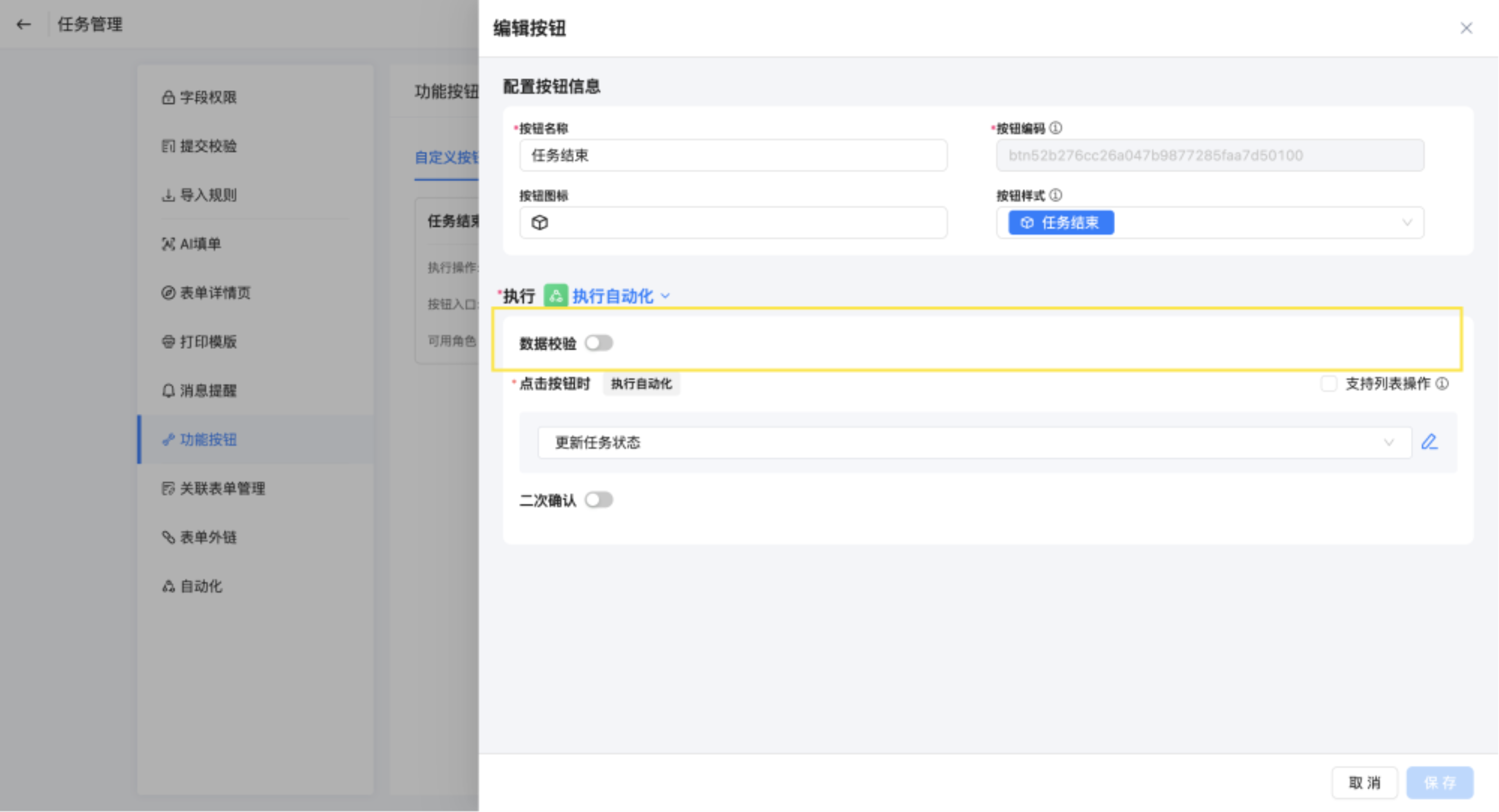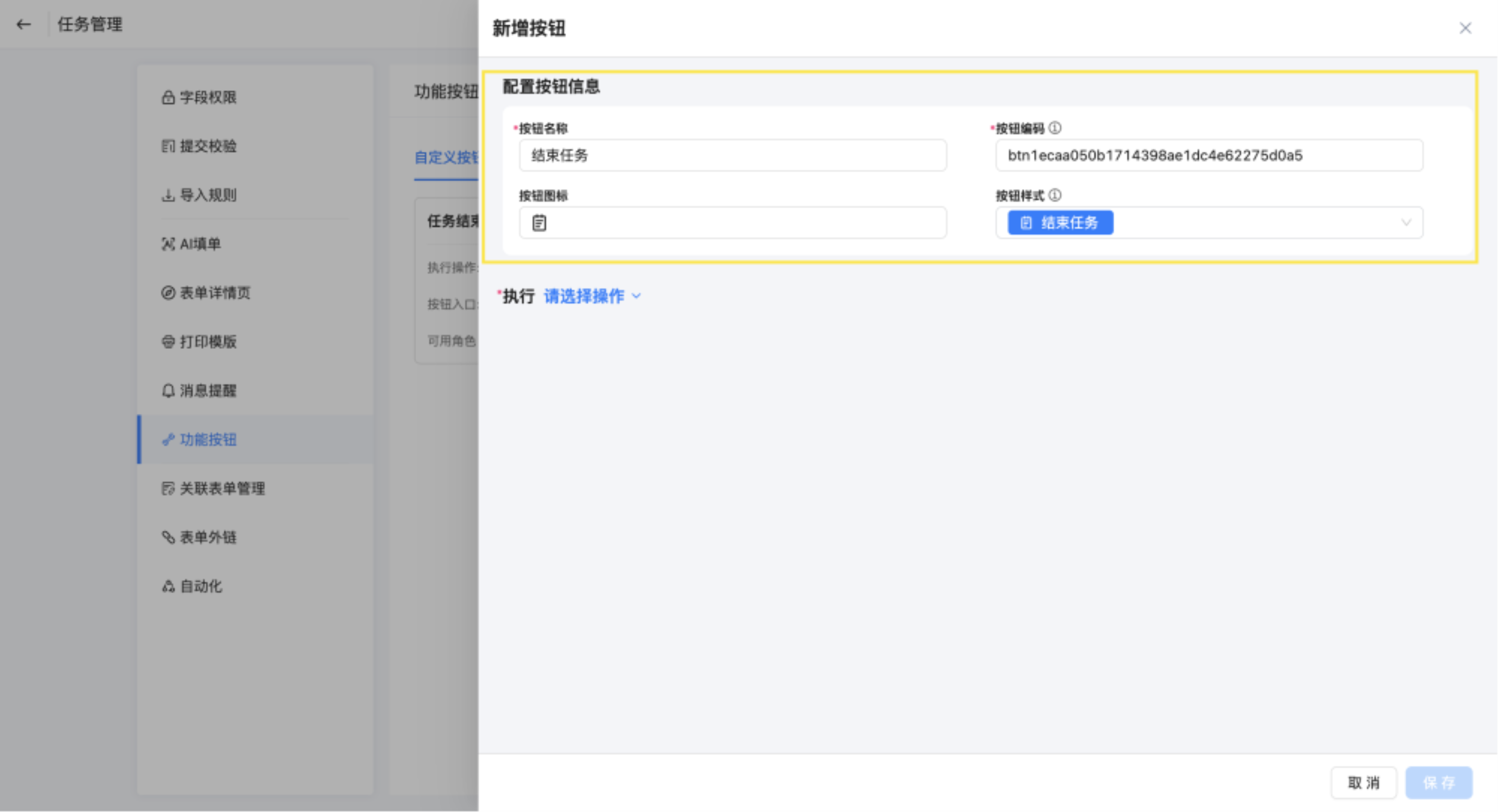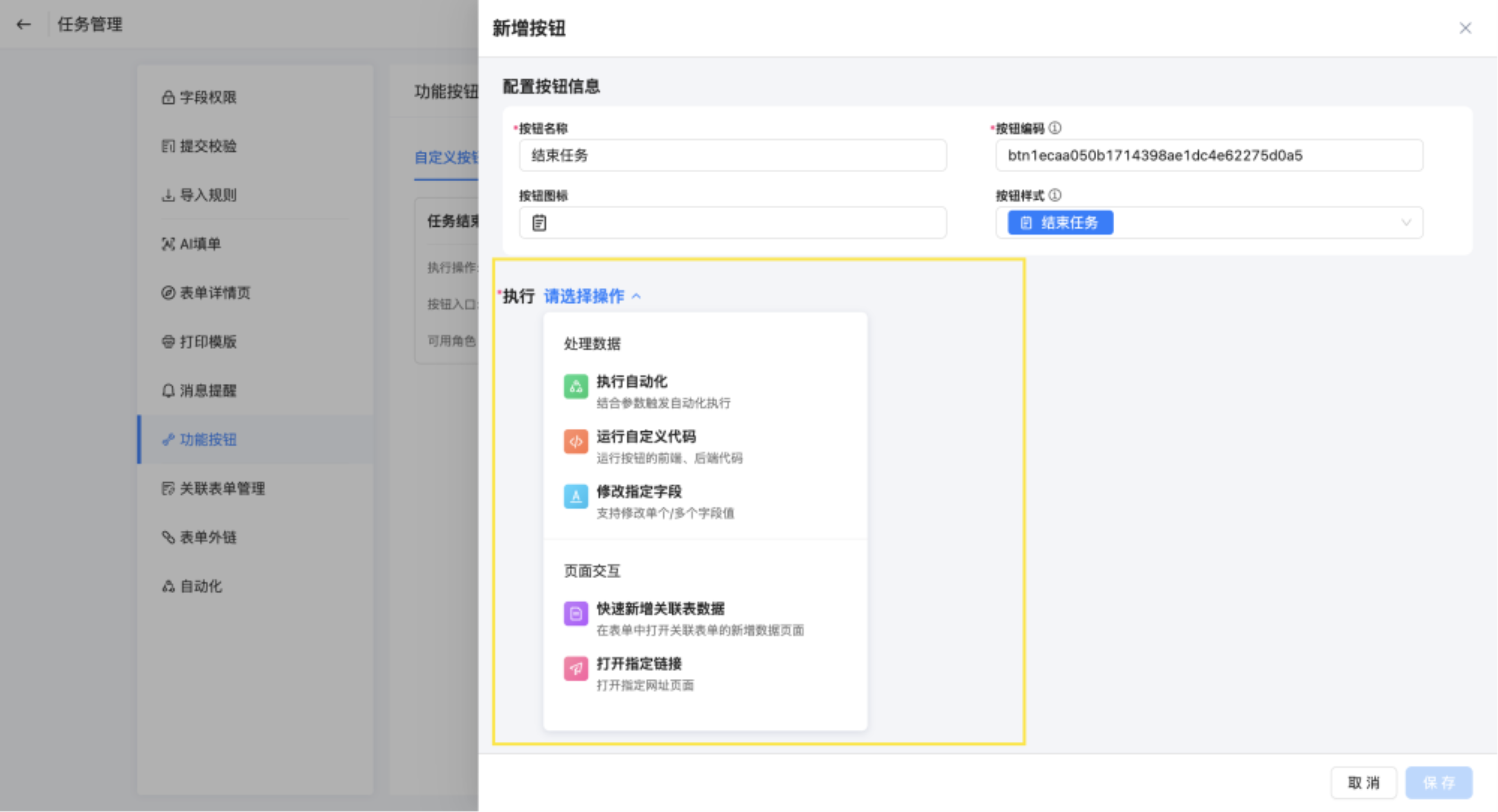 新增按钮,命名为任务结束,执行选择执行自动化。