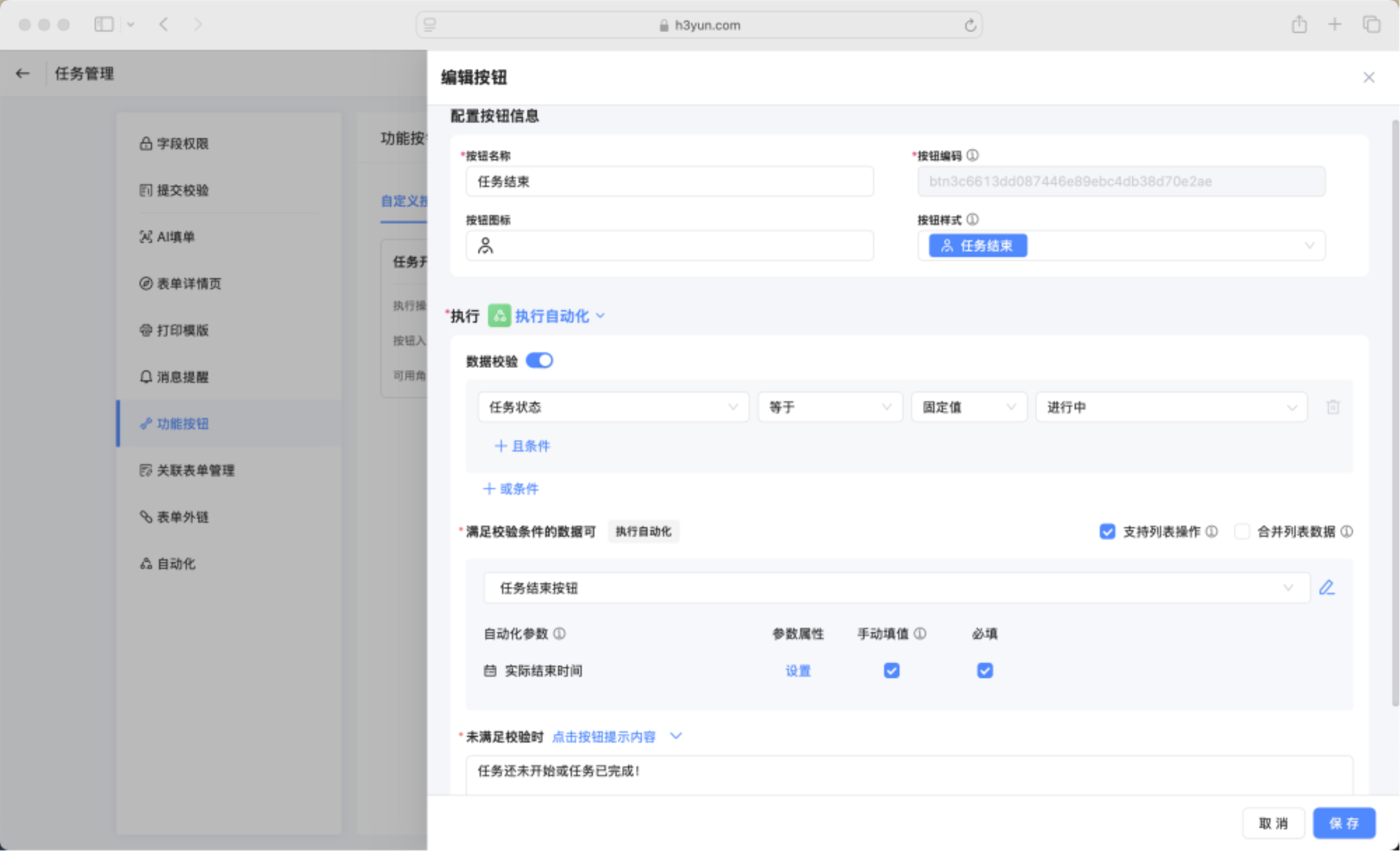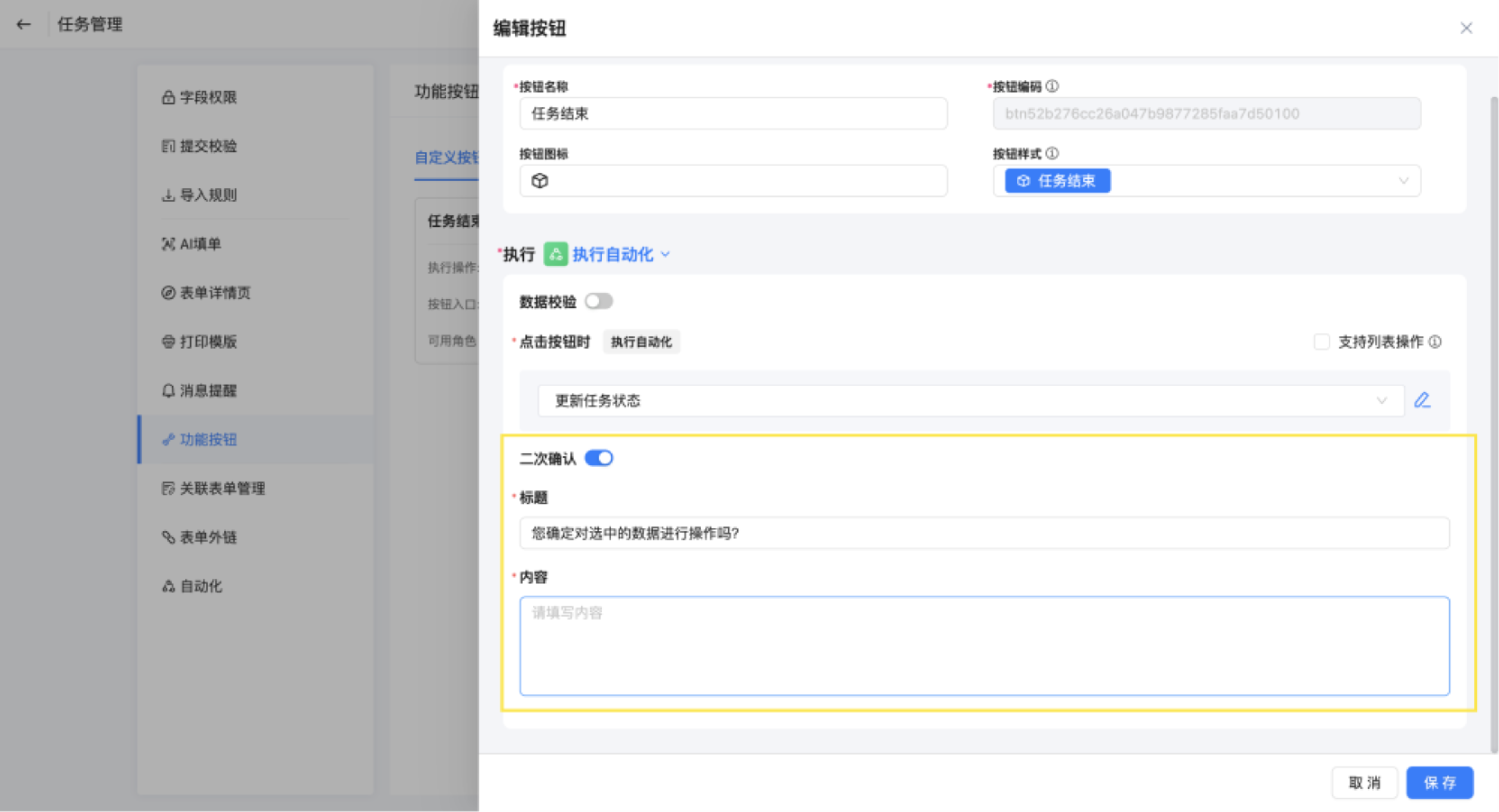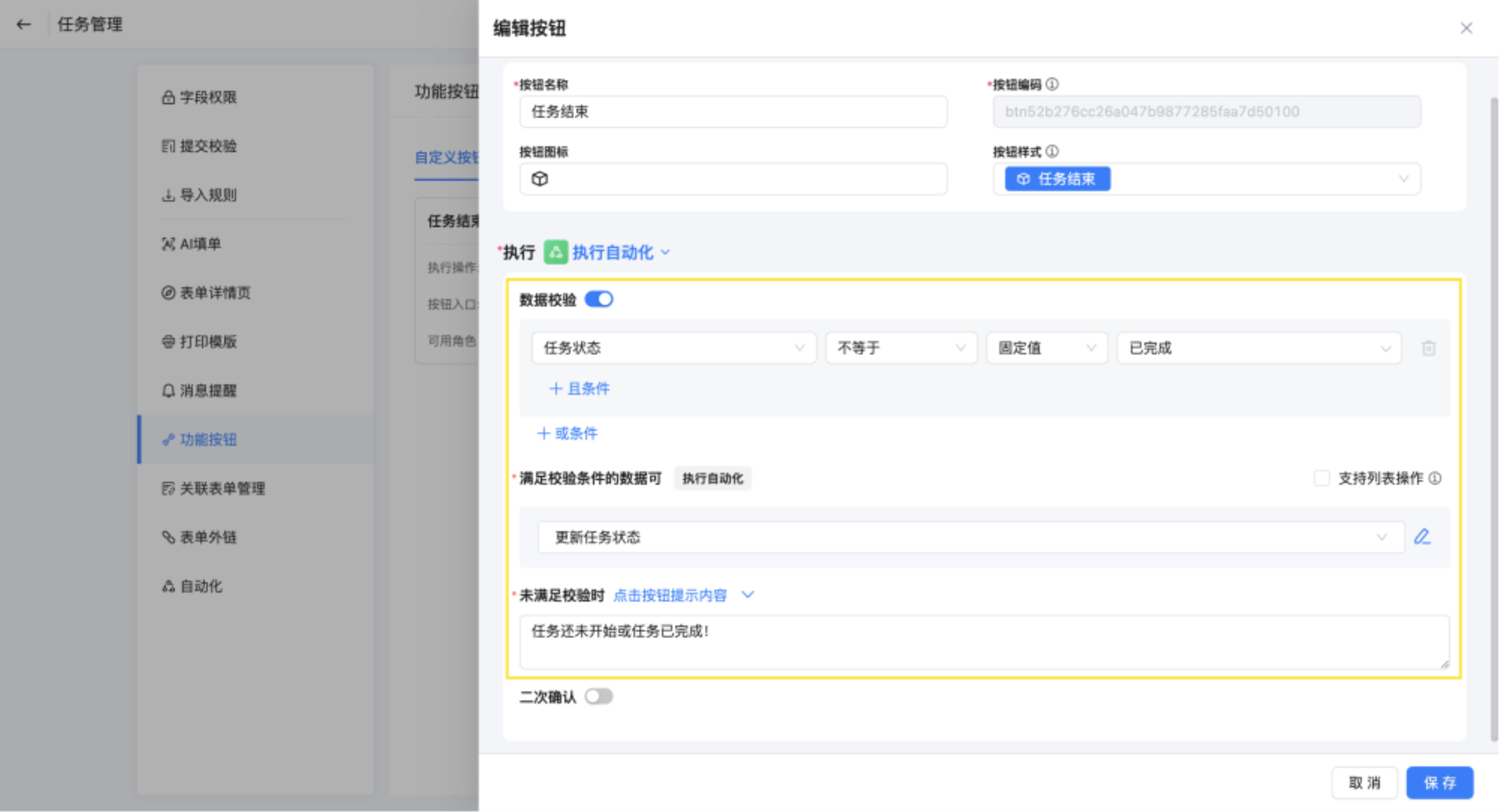 新增按钮,命名为任务结束,执行选择执行自动化。