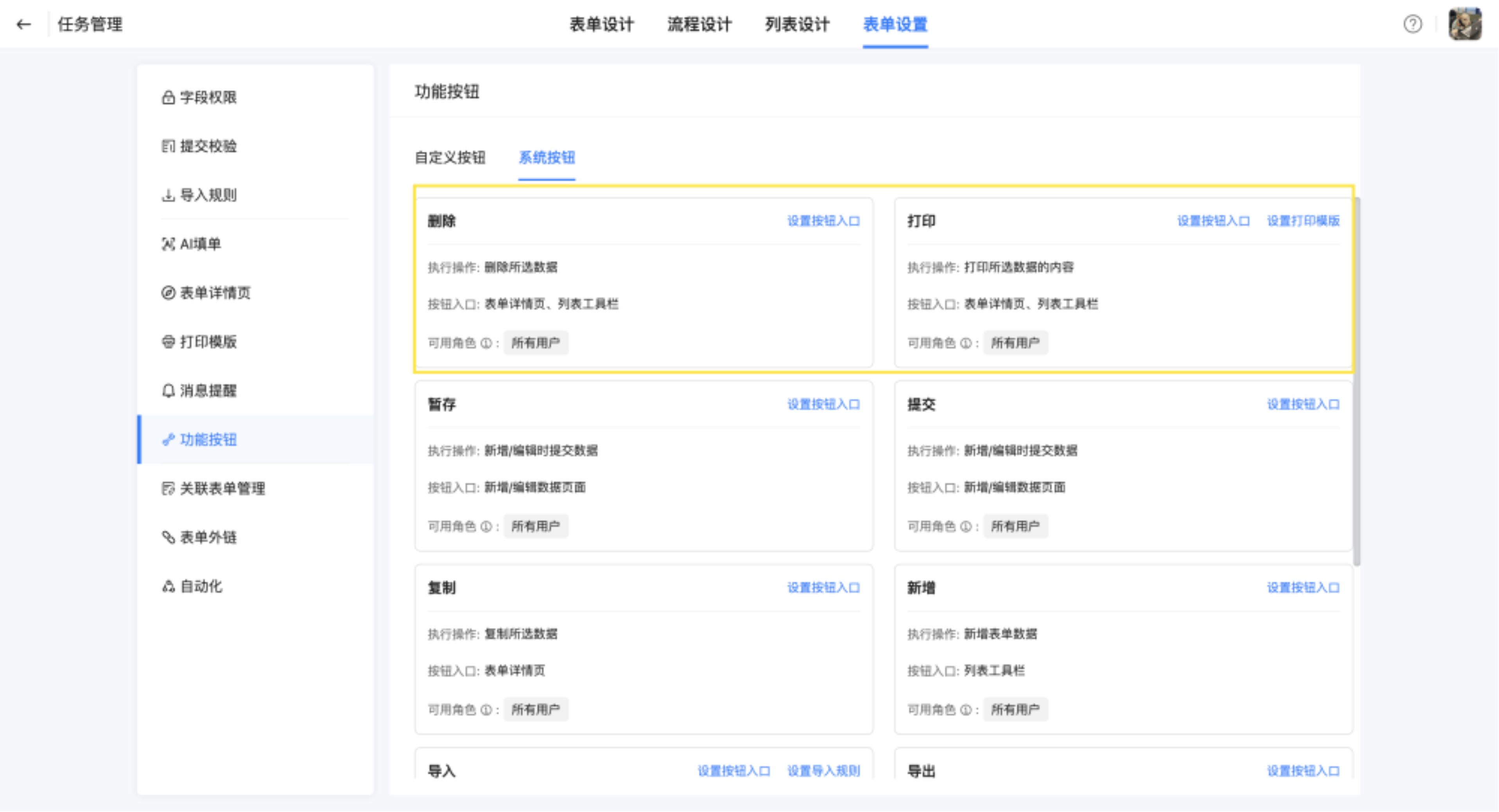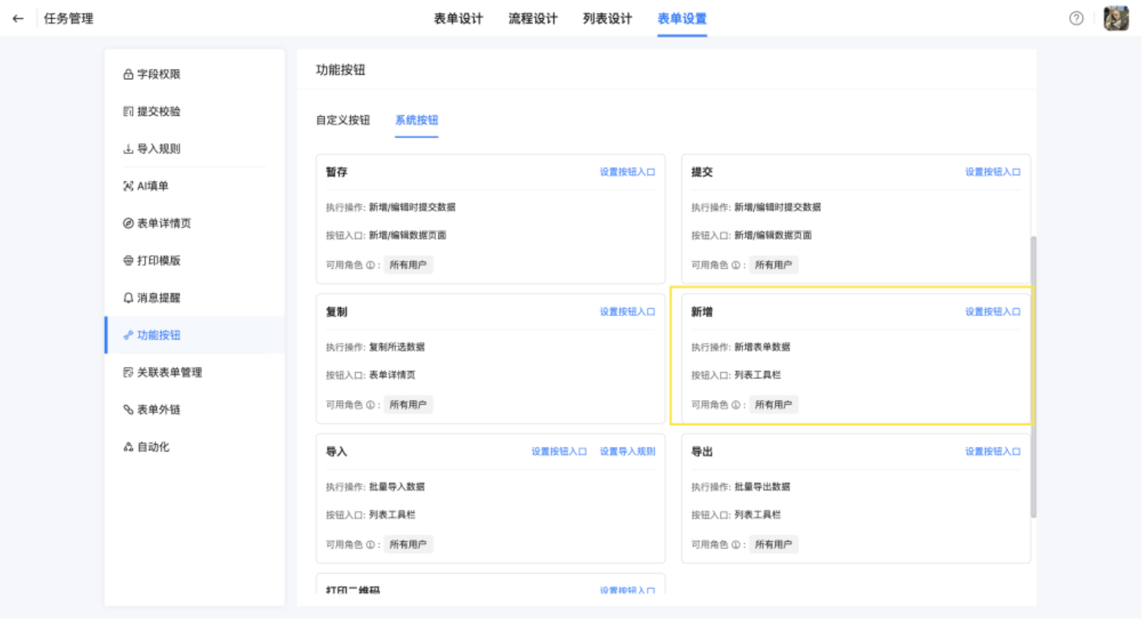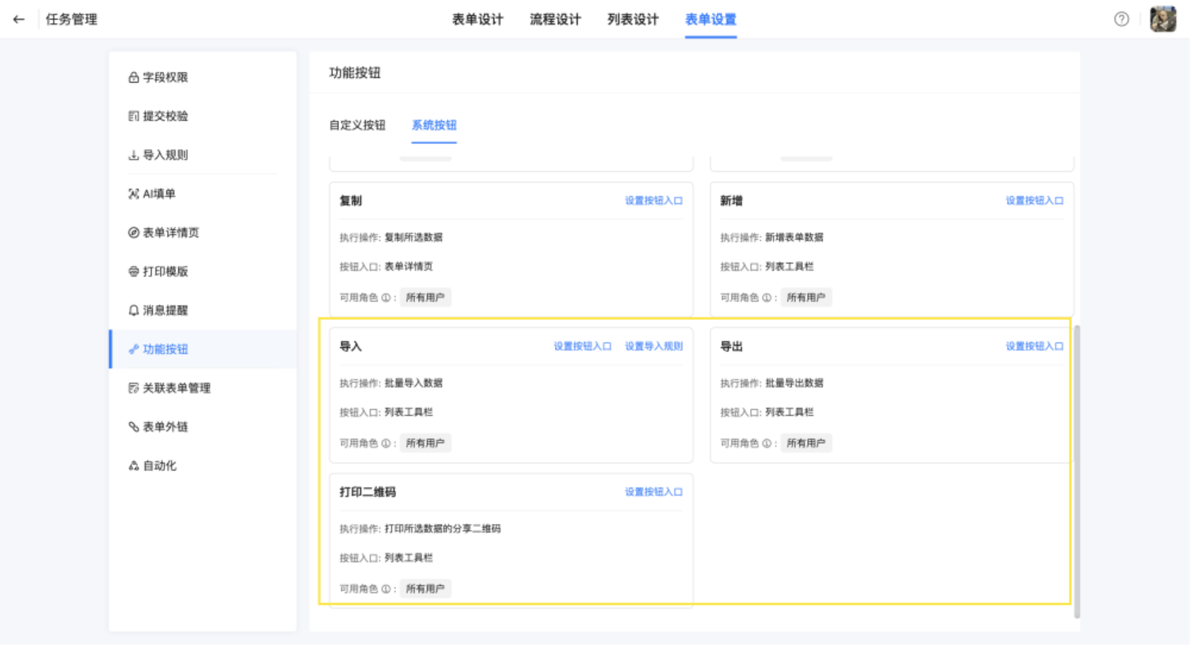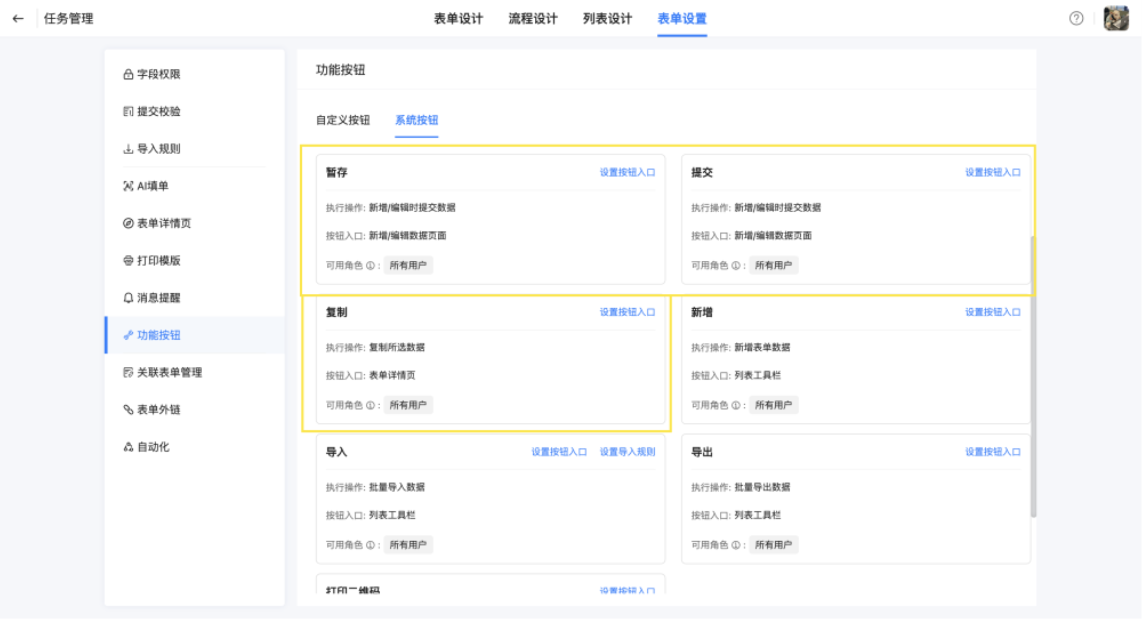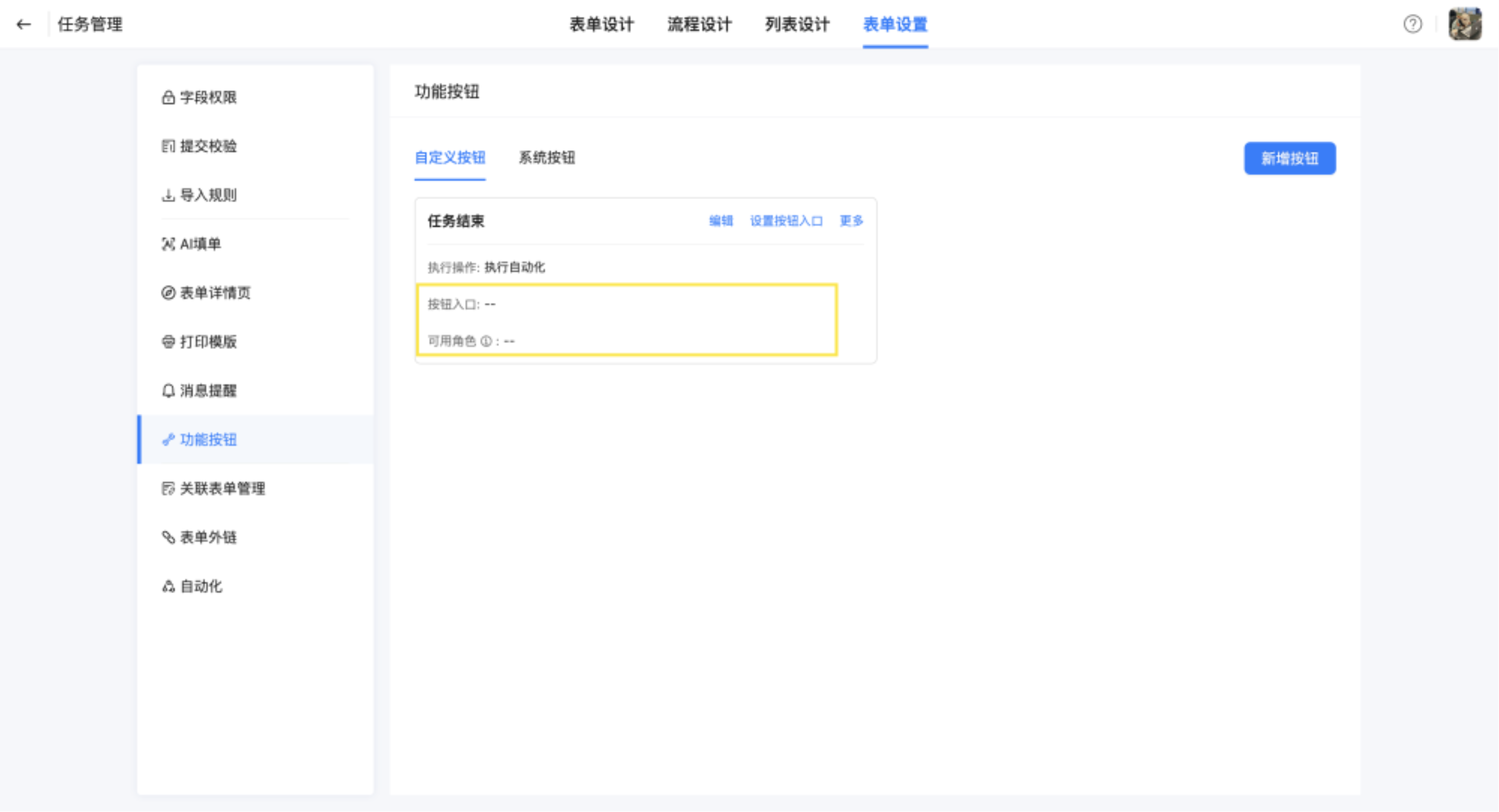 统一管理当前表单的自定义按钮和系统按钮,支持自定义按钮操作,同时可配置按钮入口和查看可用角色。