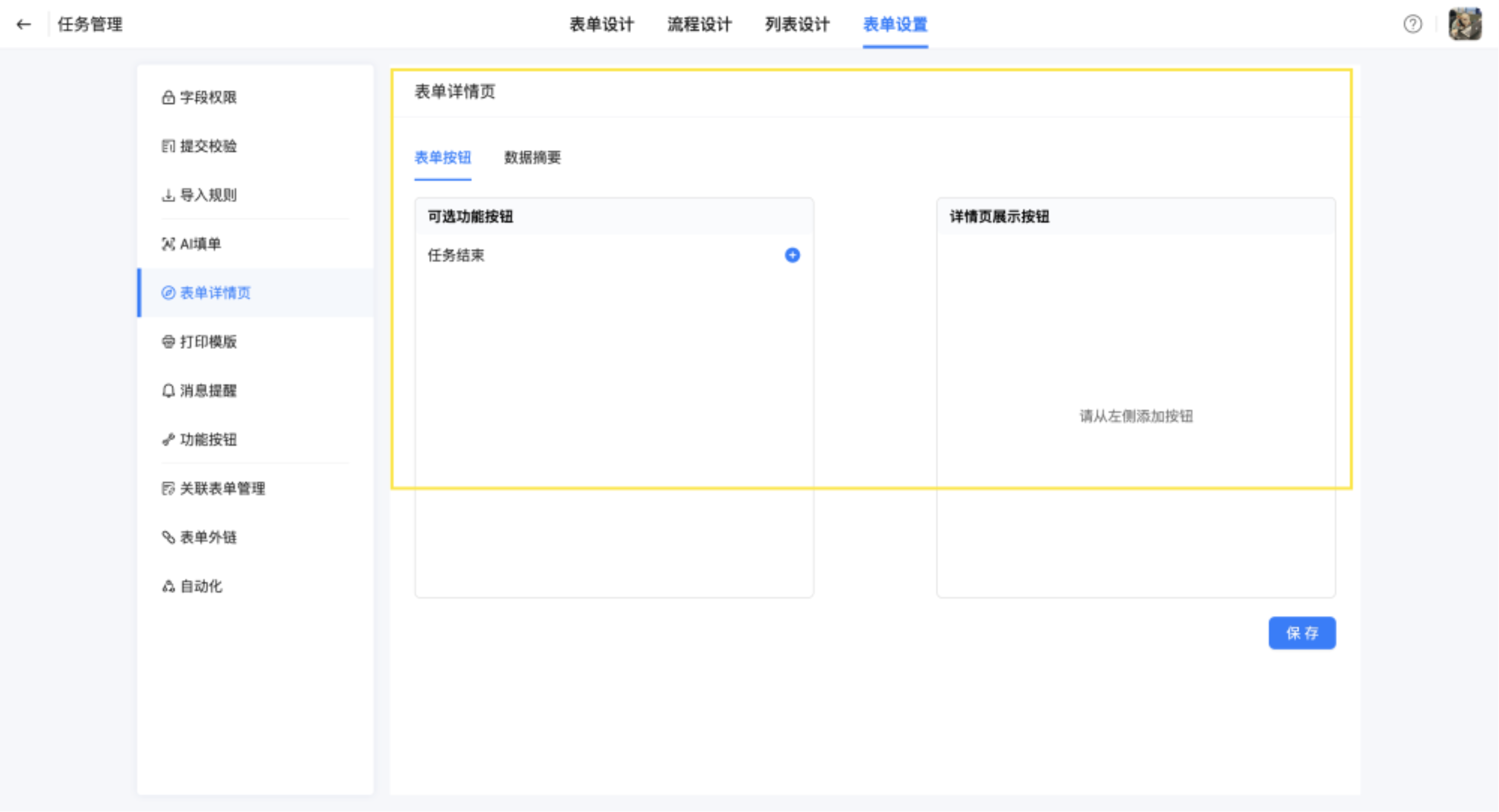设置按钮入口:选择表单详情页,保存。