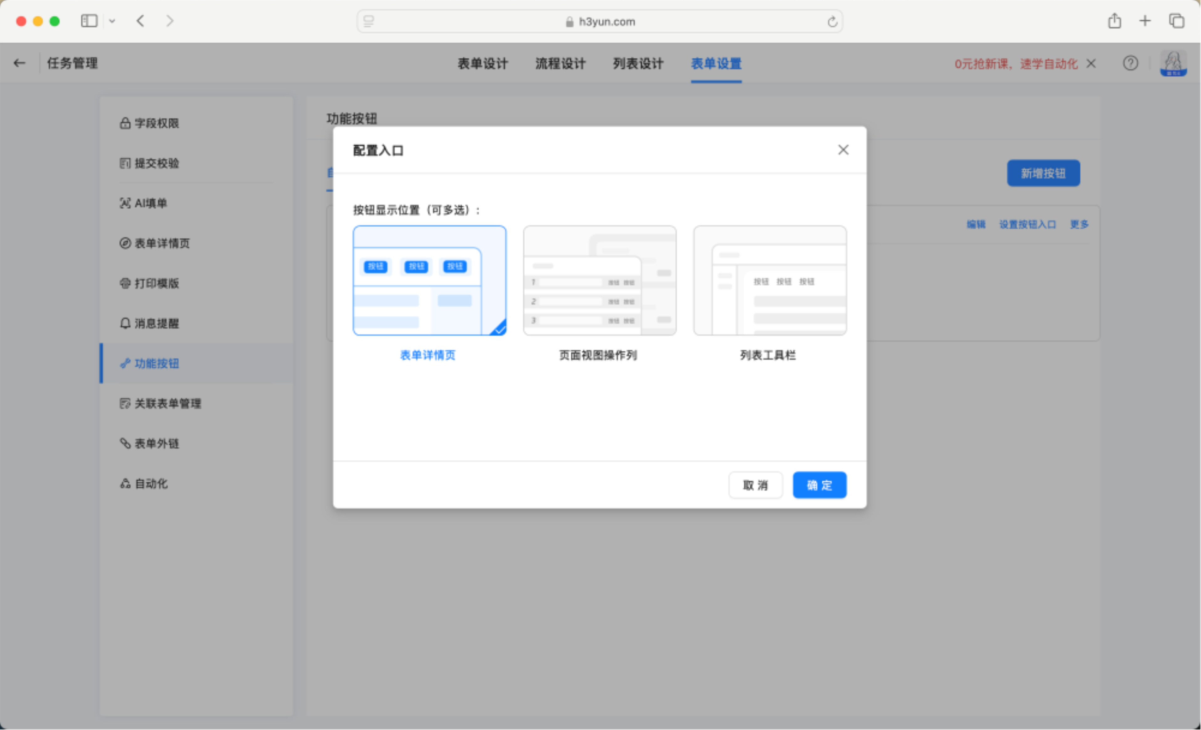 支持自定义按钮能力,可配置在表单详情页、列表视图操作、列表工具栏中使用。