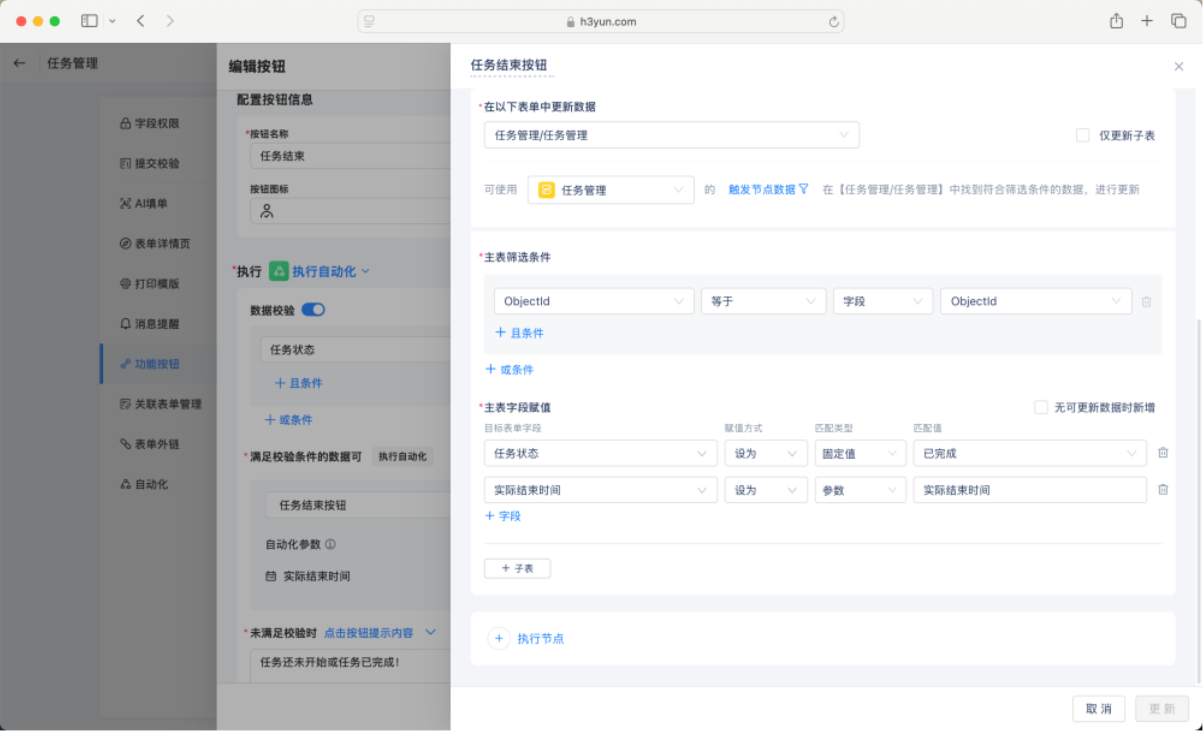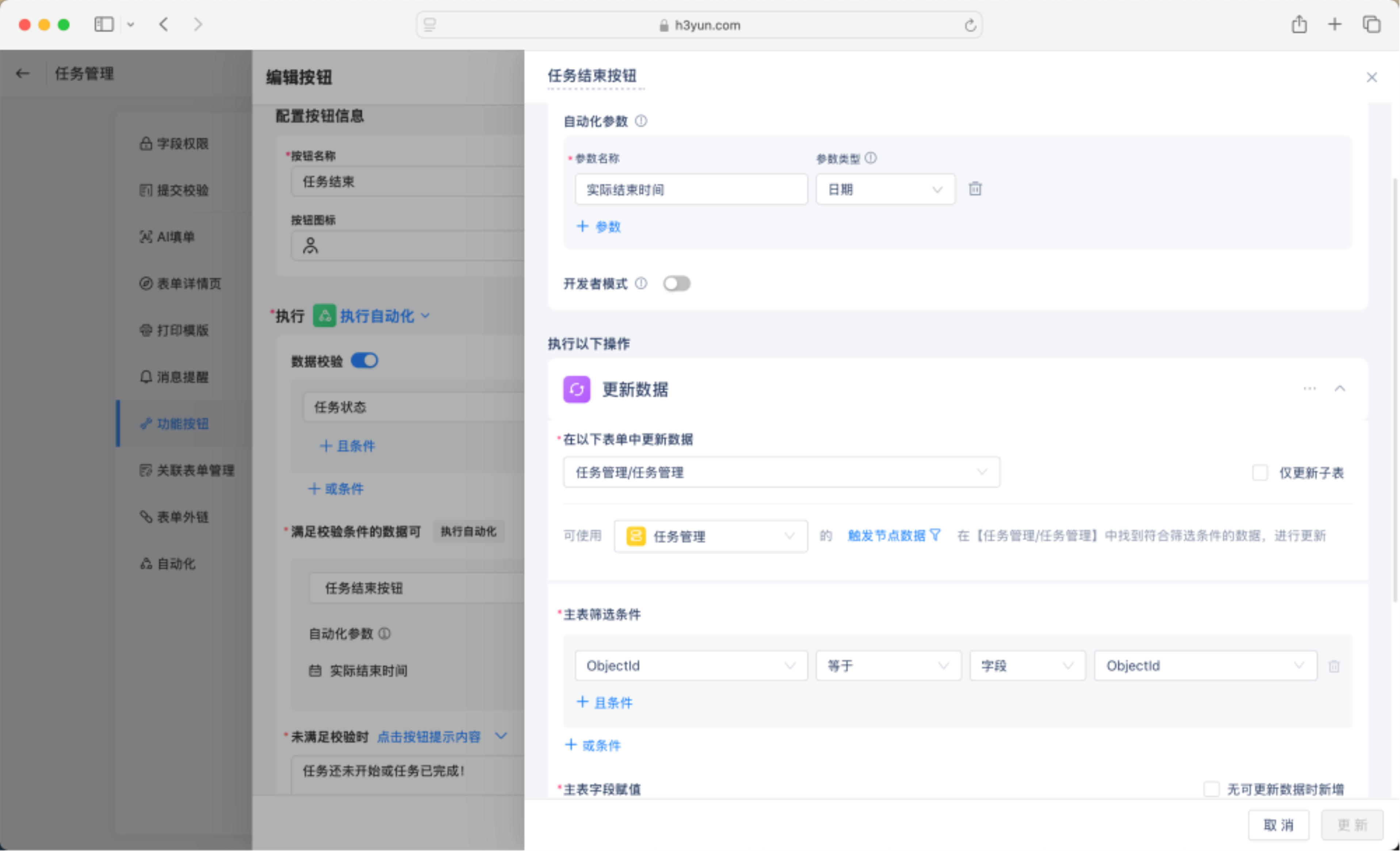 主表筛选条件为:ObjectId等于ObjectId(更新当前数据)。