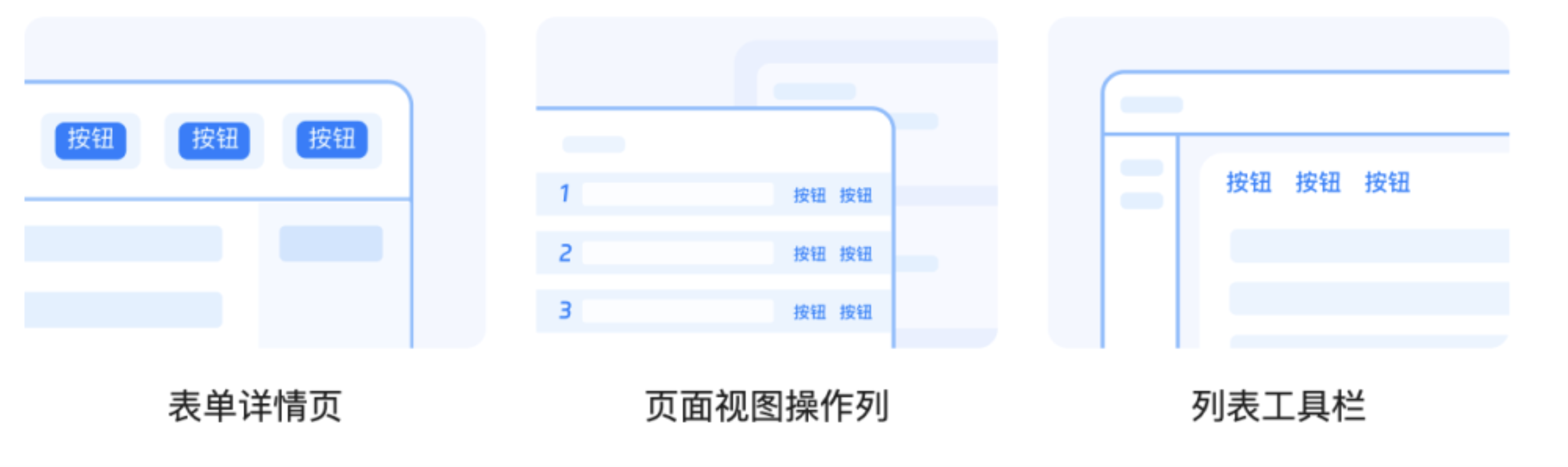 · 按钮入口也可在对应的表单详情页、页面视图操作列、列表工具栏中添加按钮