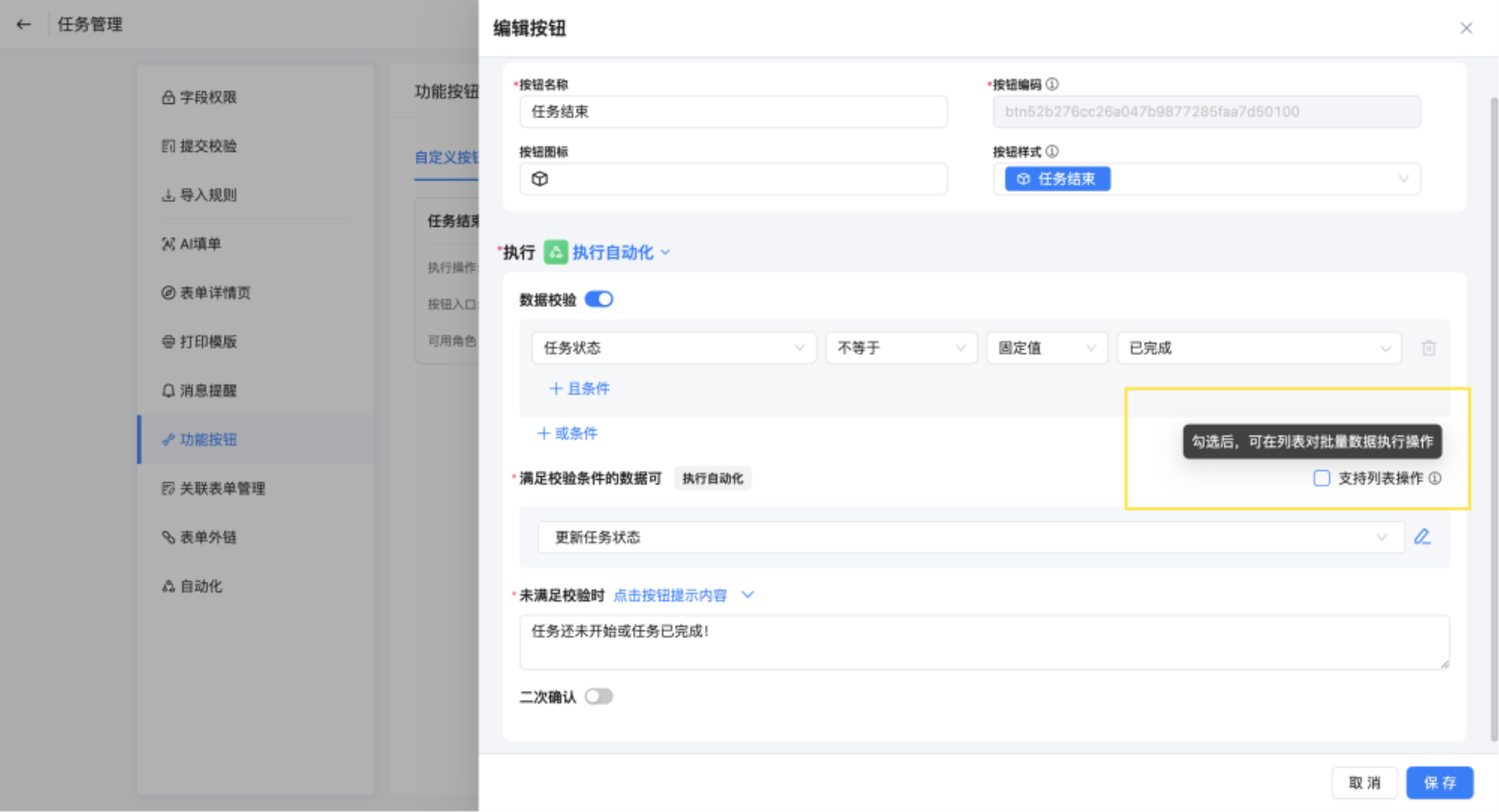 支持列表操作:按钮操作默认对单条数据生效,勾选此项后,允许列表对批量数据执行操作。