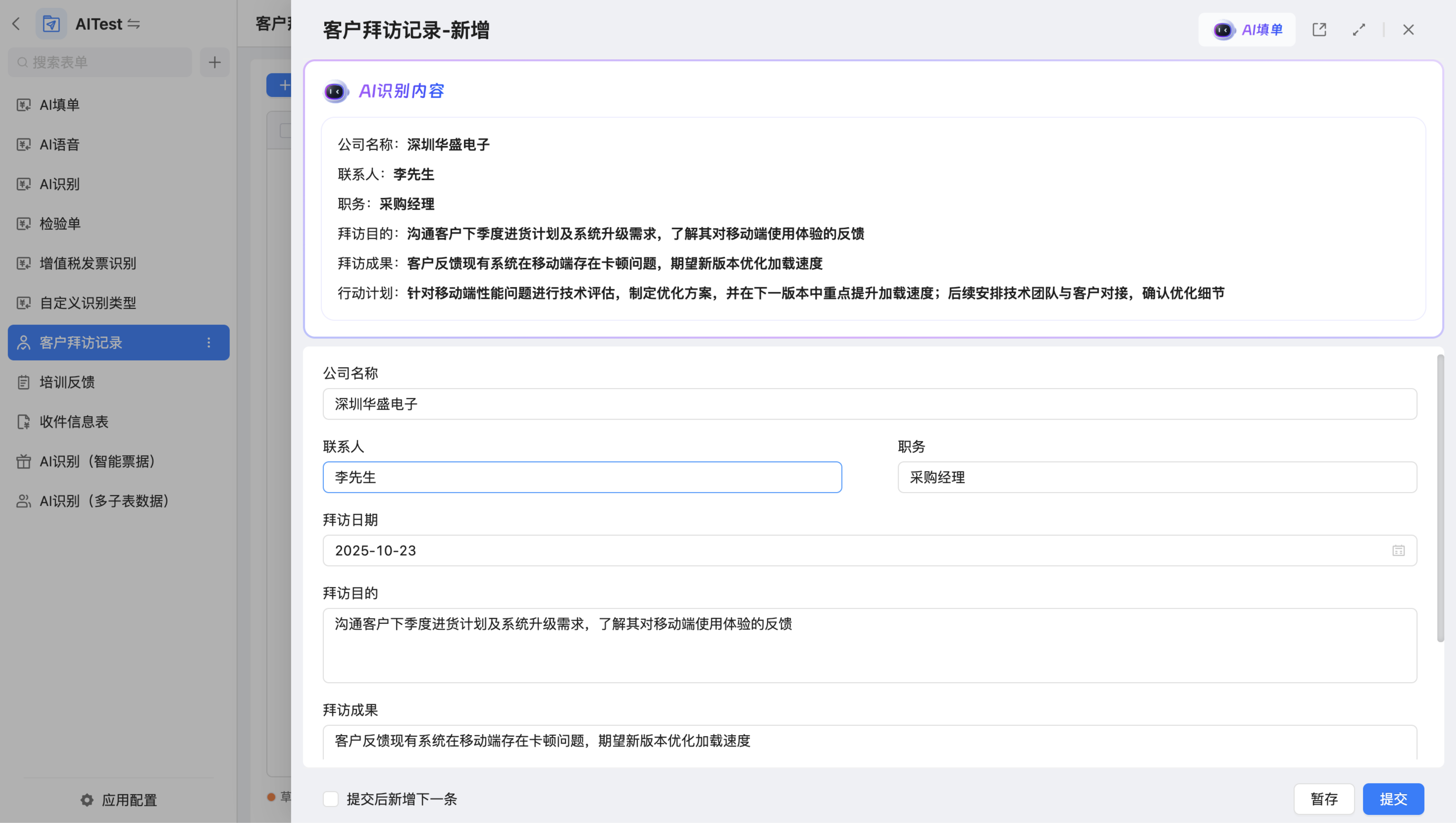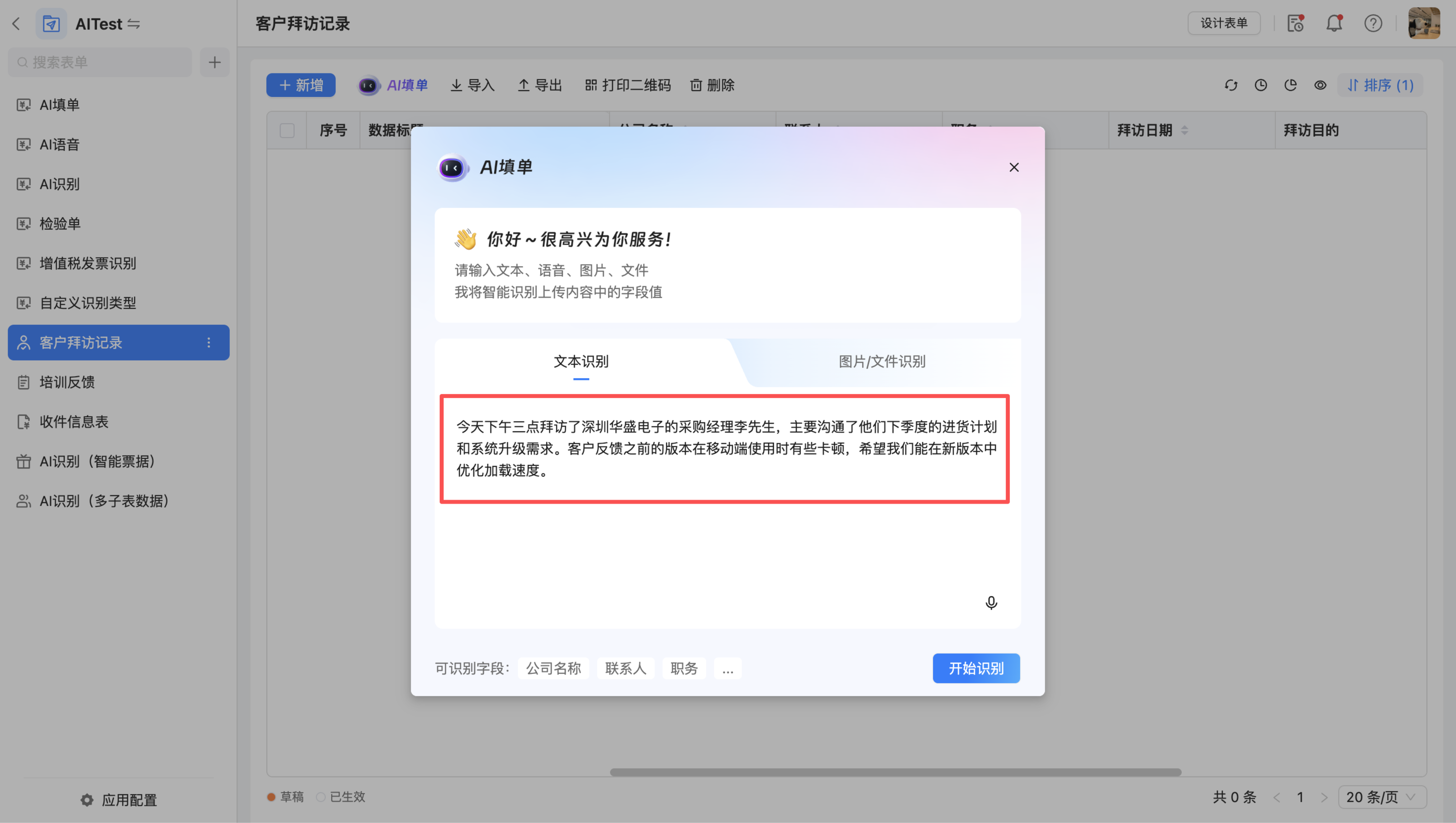 功能名称:本次操作使用的 AI 功能(AI填单/AI识别/AI语音录入);