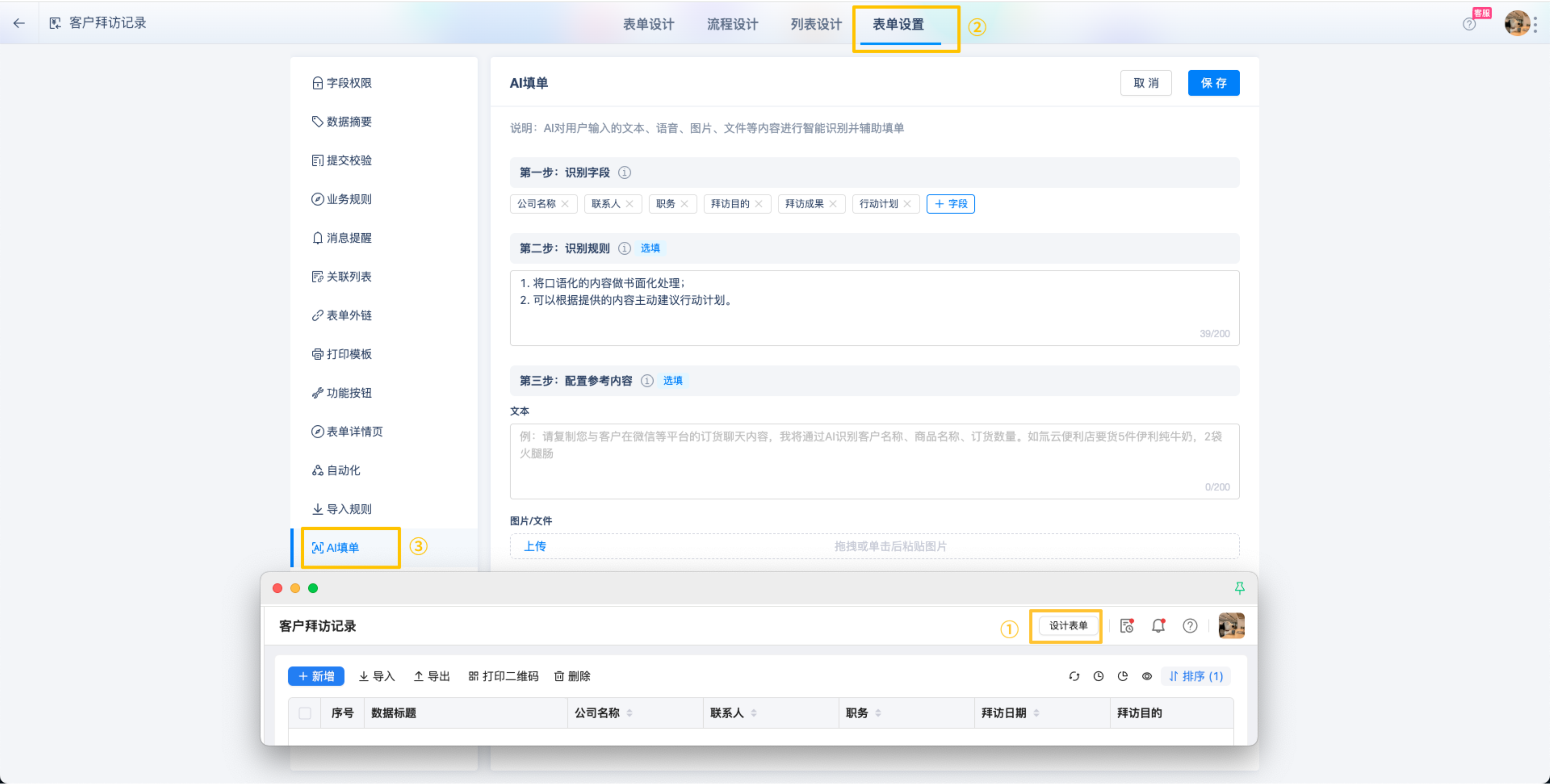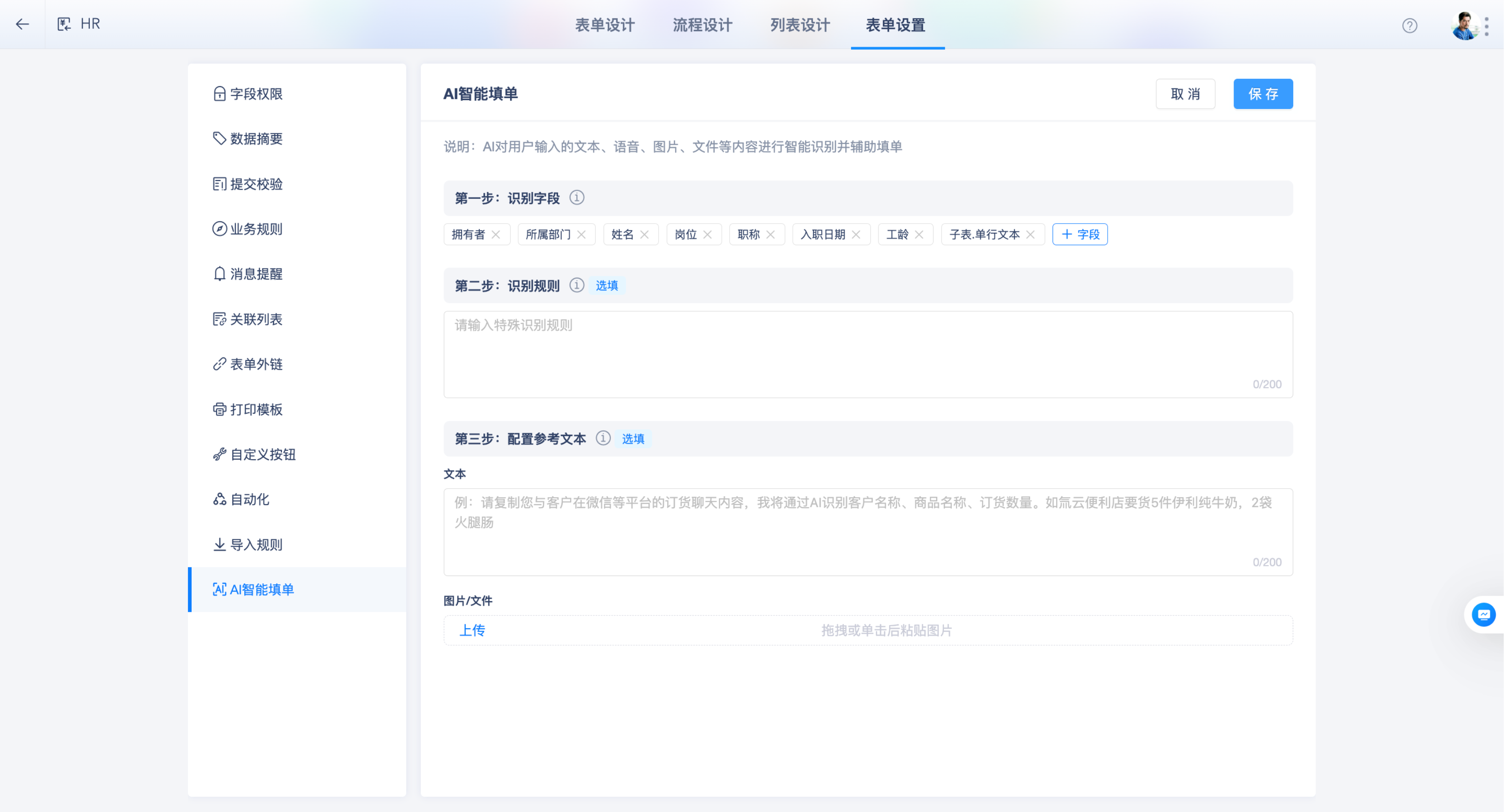 配置入口:设计表单>表单设置>AI填单