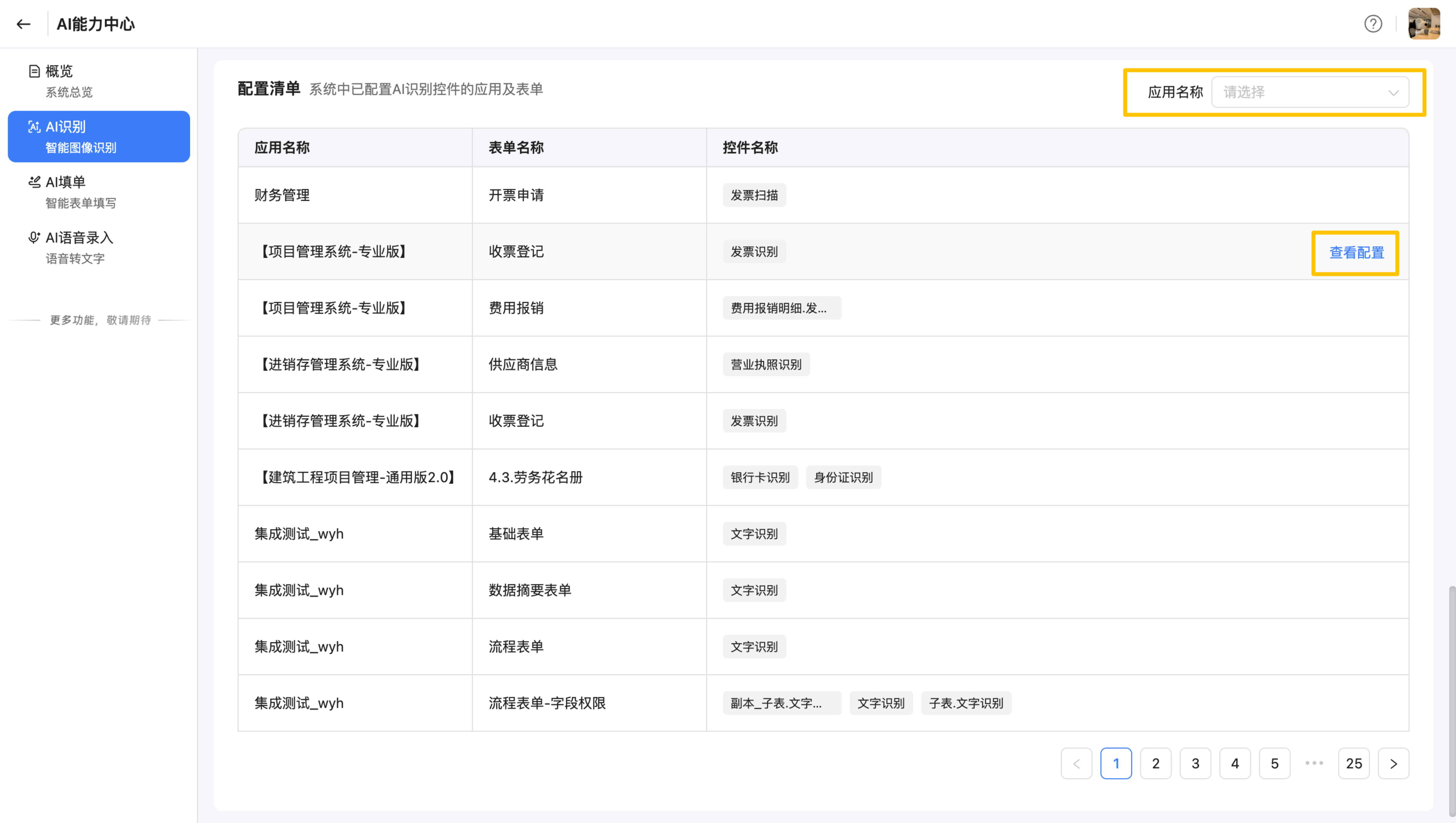 配置清单:在配置清单中,系统会集中展示已配置AI识别控件的应用及表单,包含以下字段: