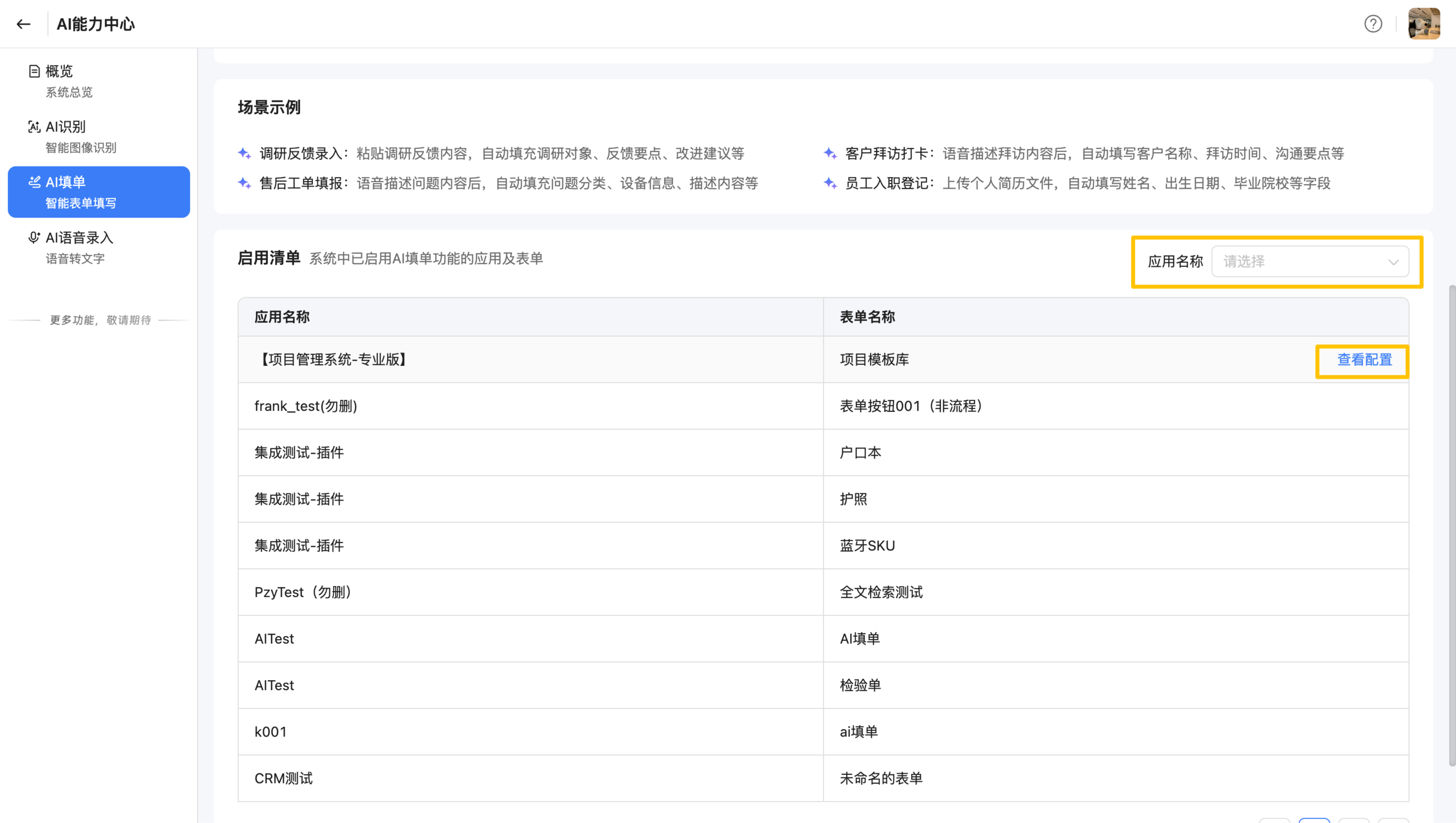 用户可通过应用名称筛选快速定位到目标应用。点击查看配置后,可直接进入该表单的表单设置页,查看或修改AI填单的配置。