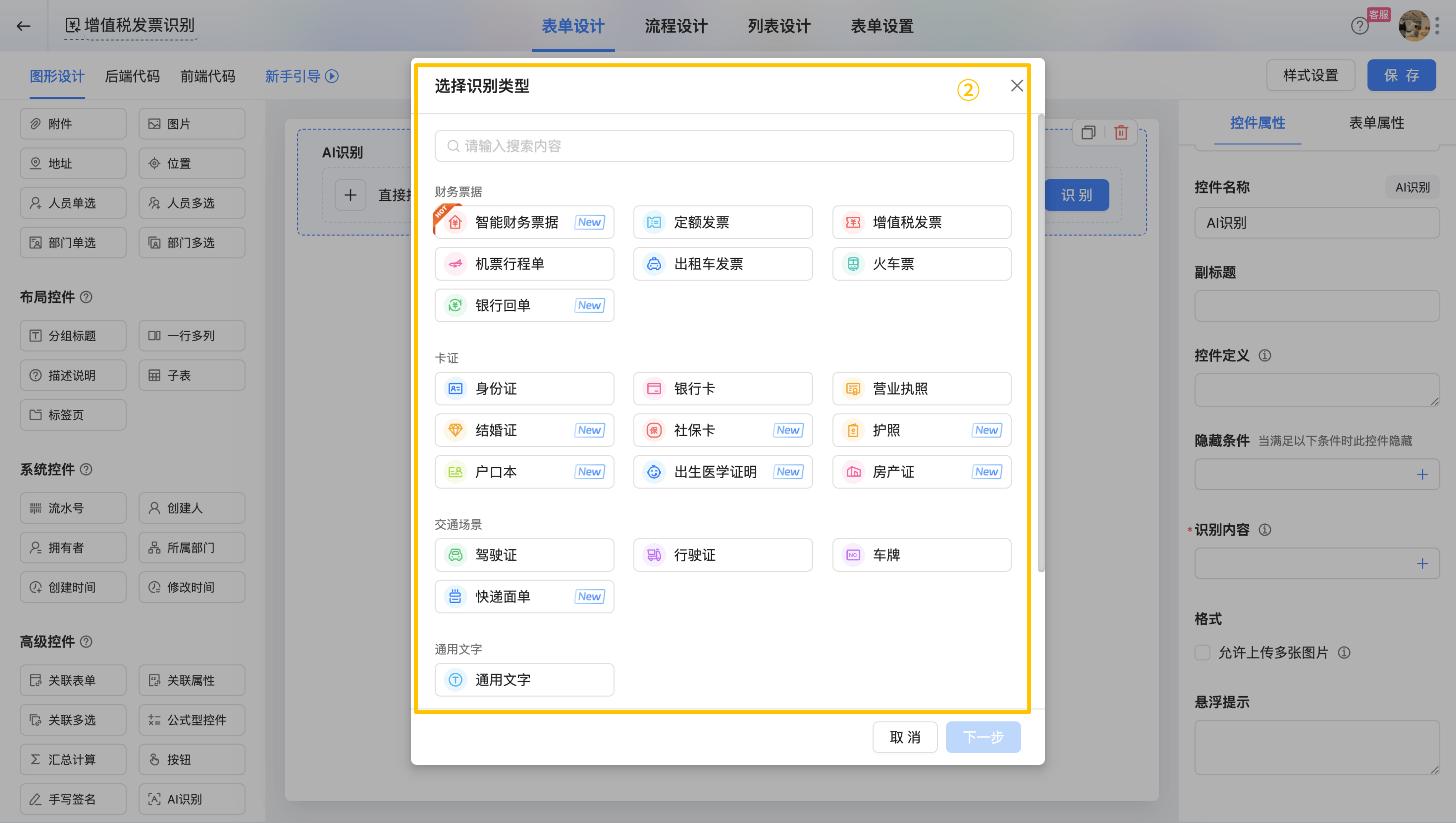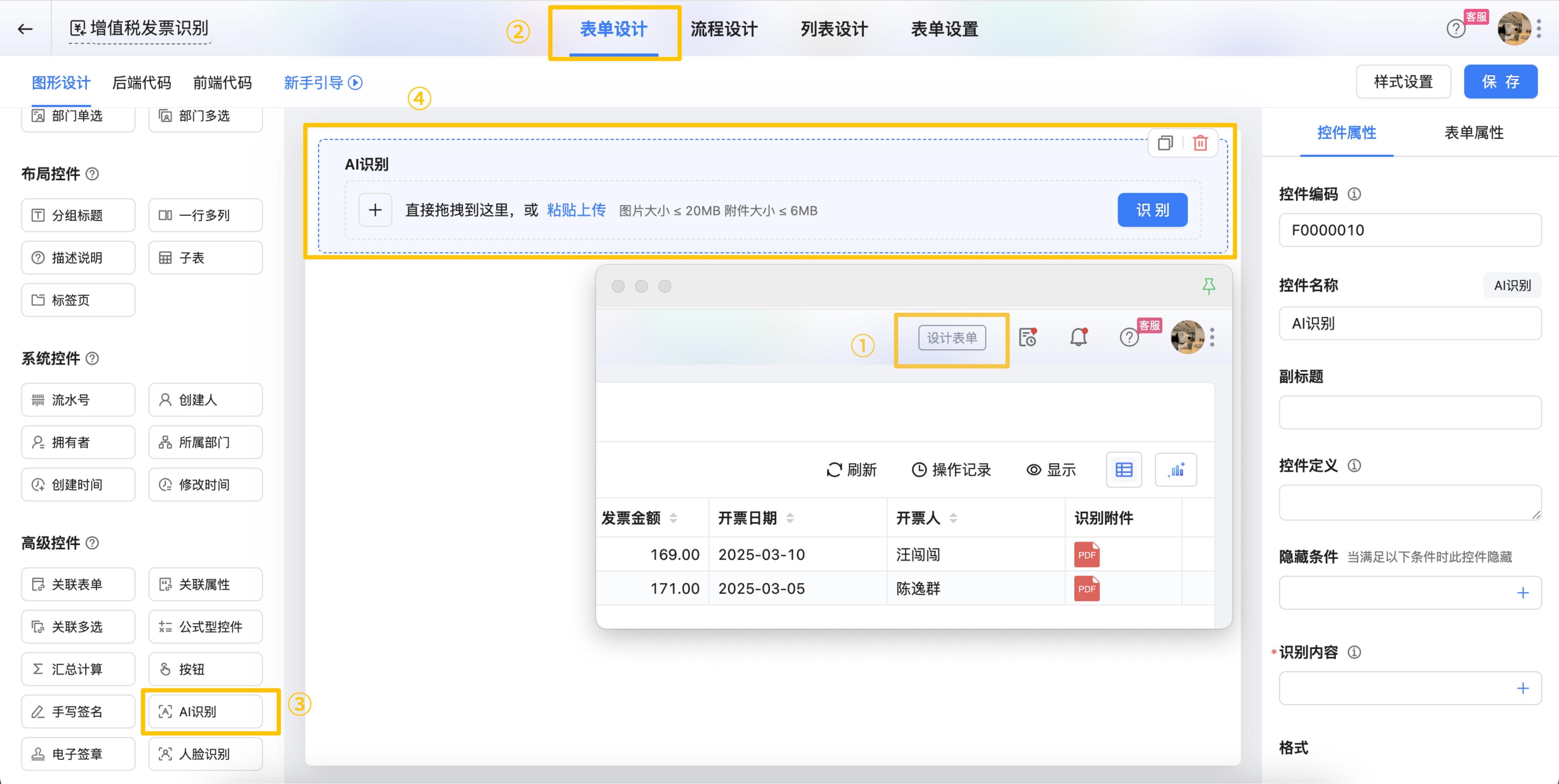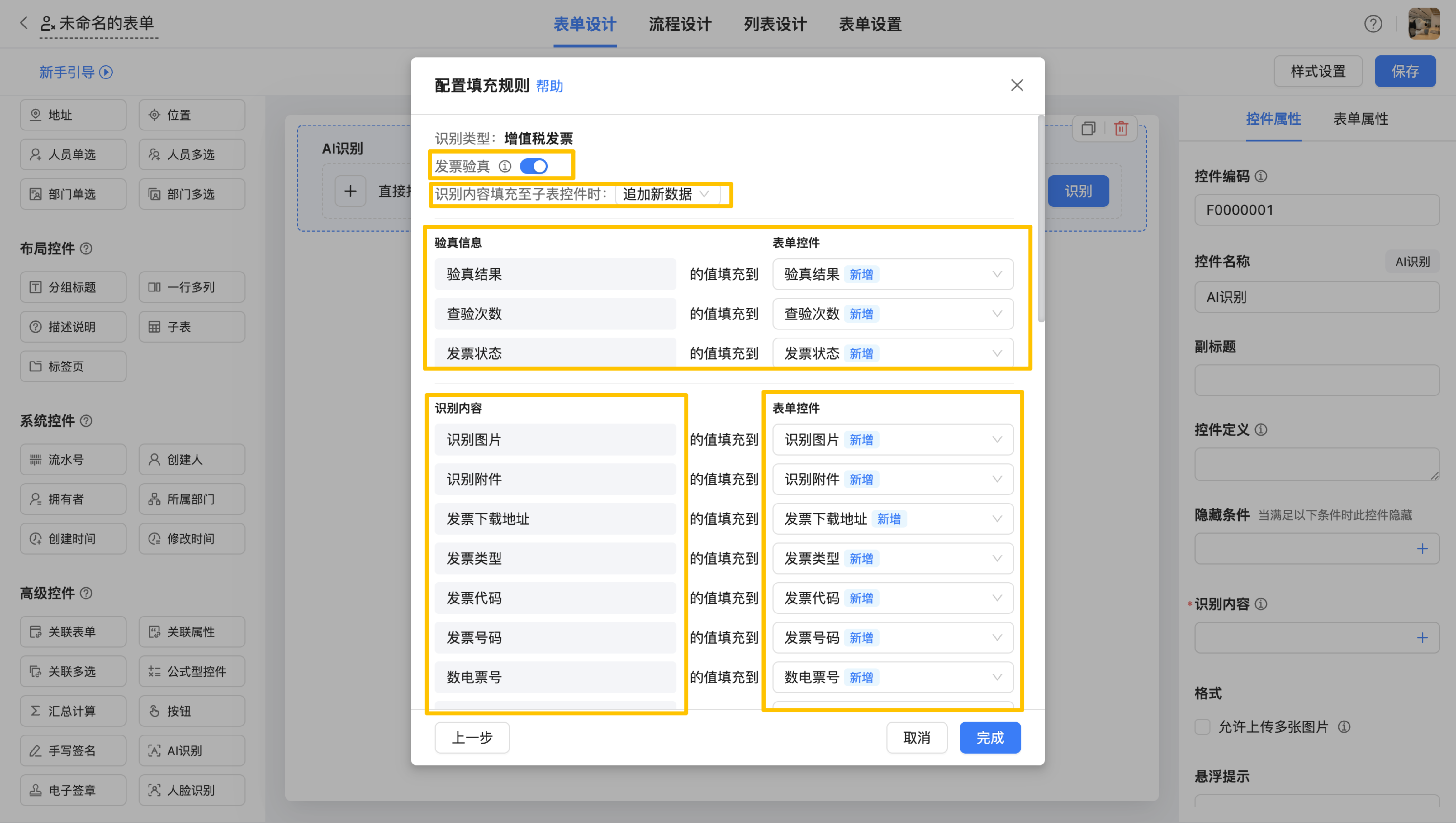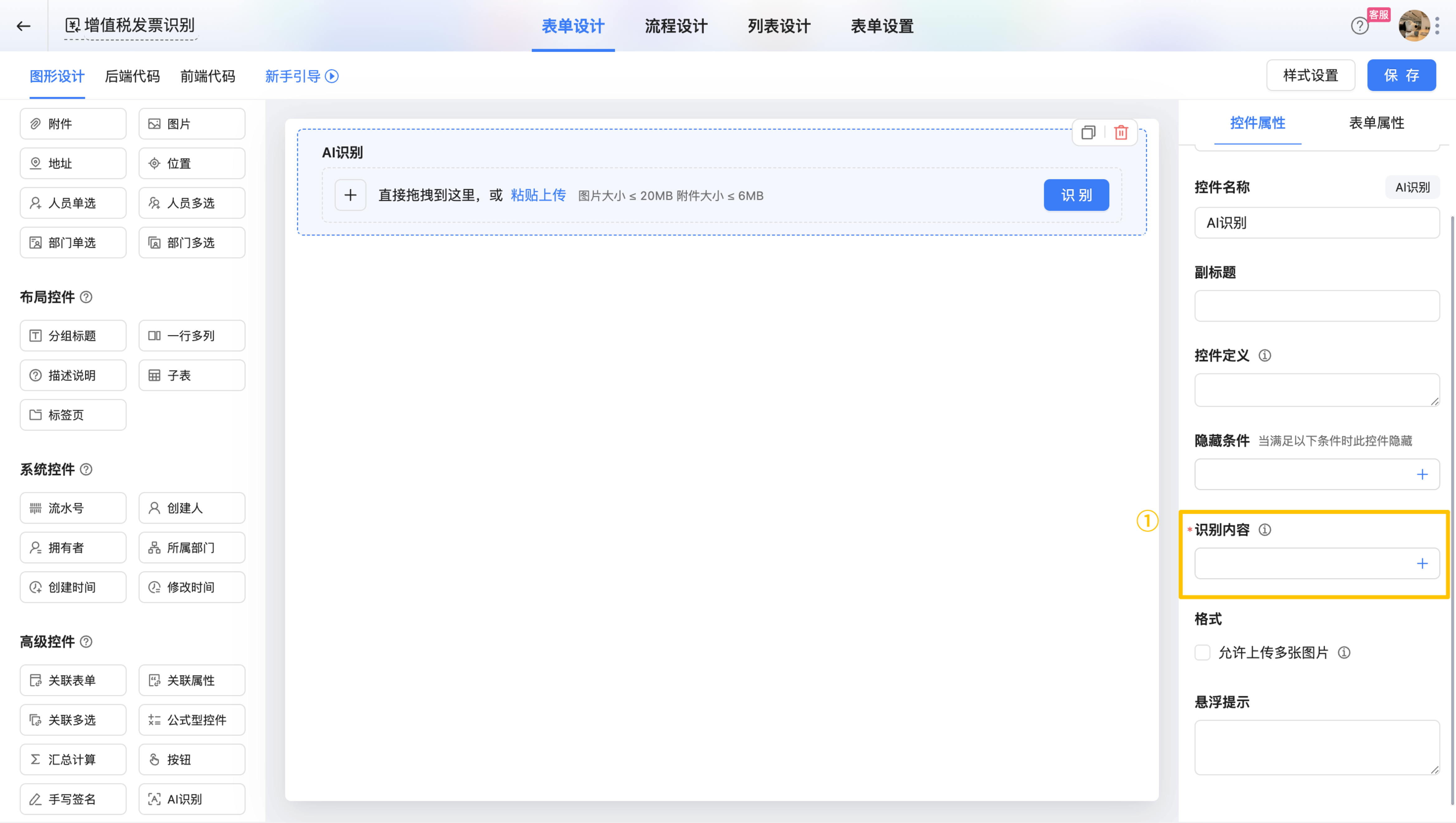配置入口:设计表单>表单设计>高级控件>AI识别