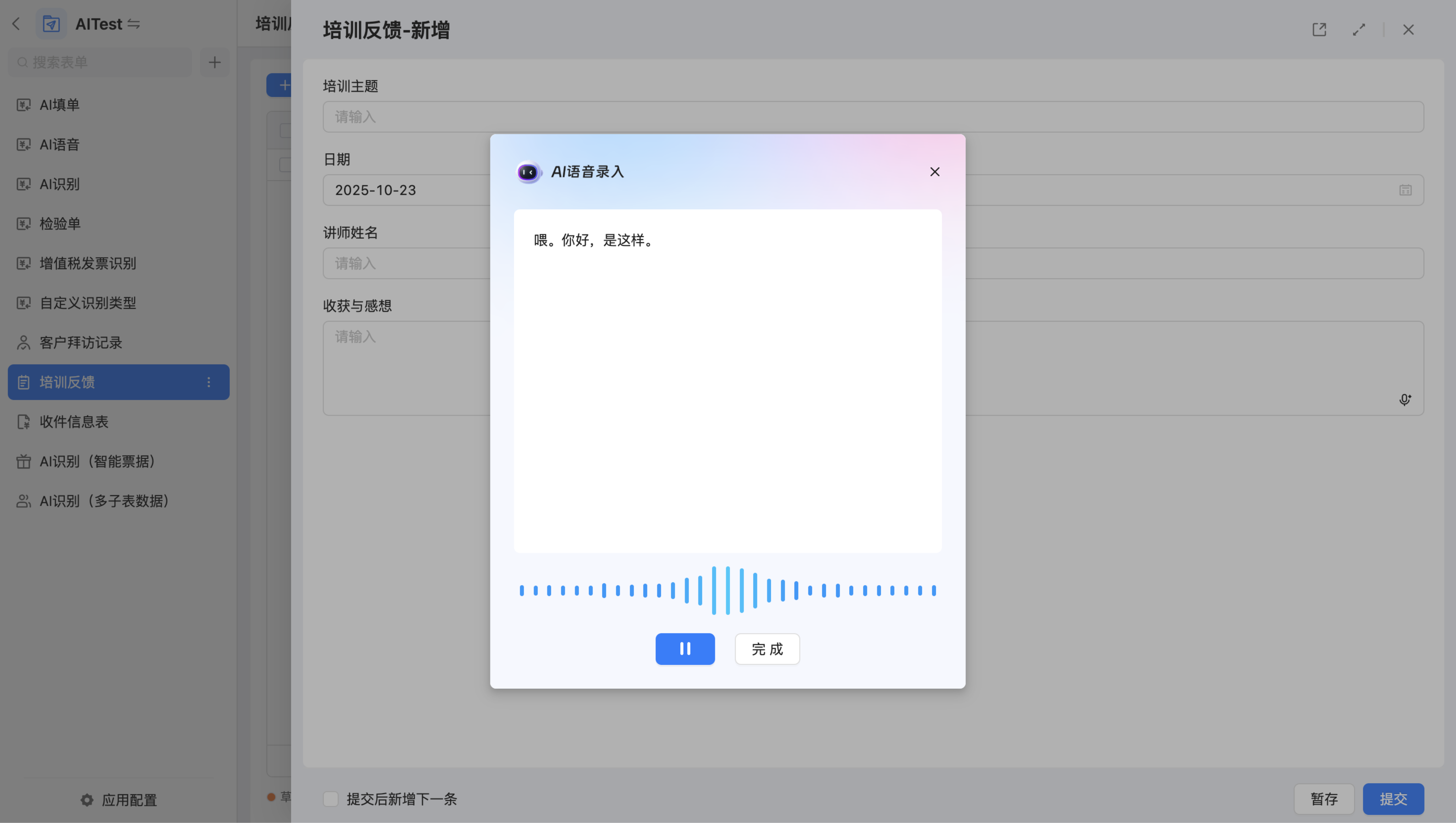 AI语音录入功能支持用户在表单中通过语音实时输入内容,系统会自动识别语音并转换为文字,填入指定字段。