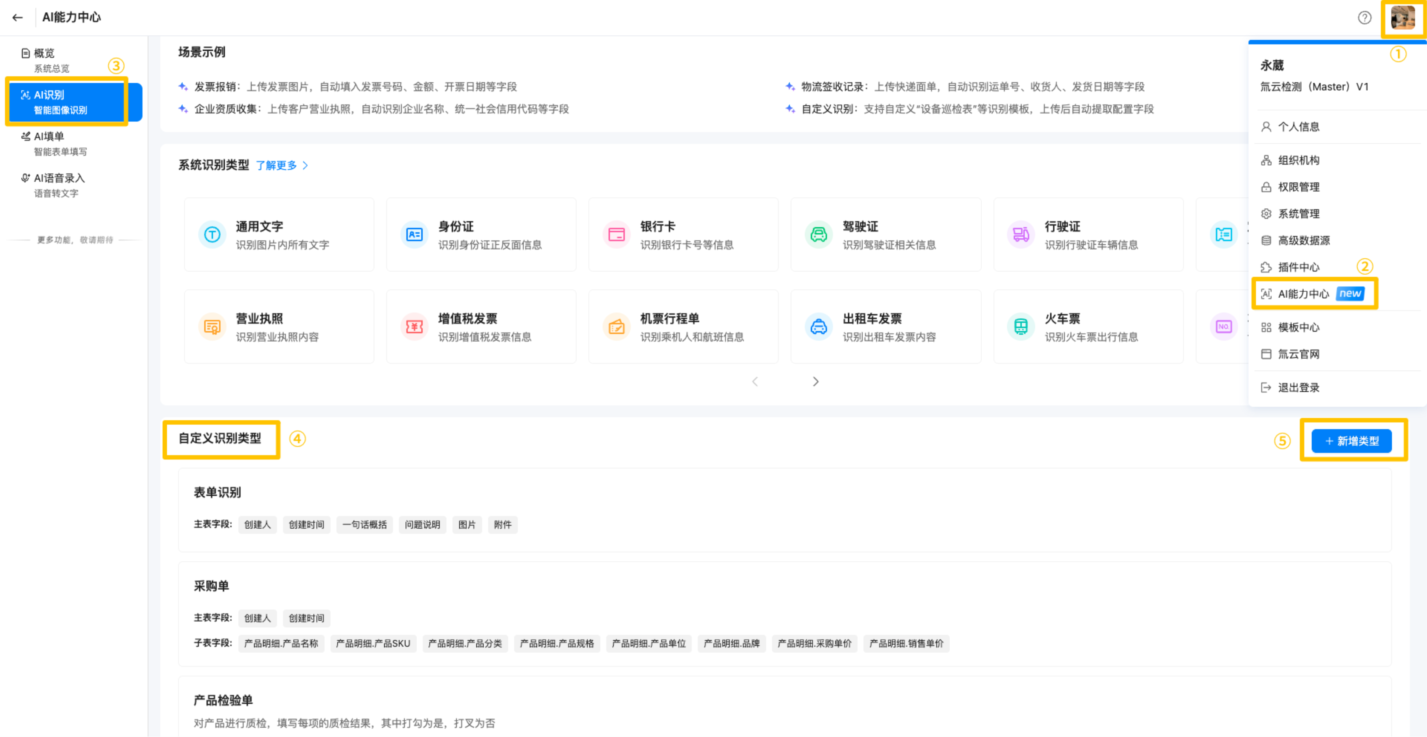 配置入口:头像>AI能力中心>AI识别>自定义识别类型,点击“新增类型”进入配置页面。