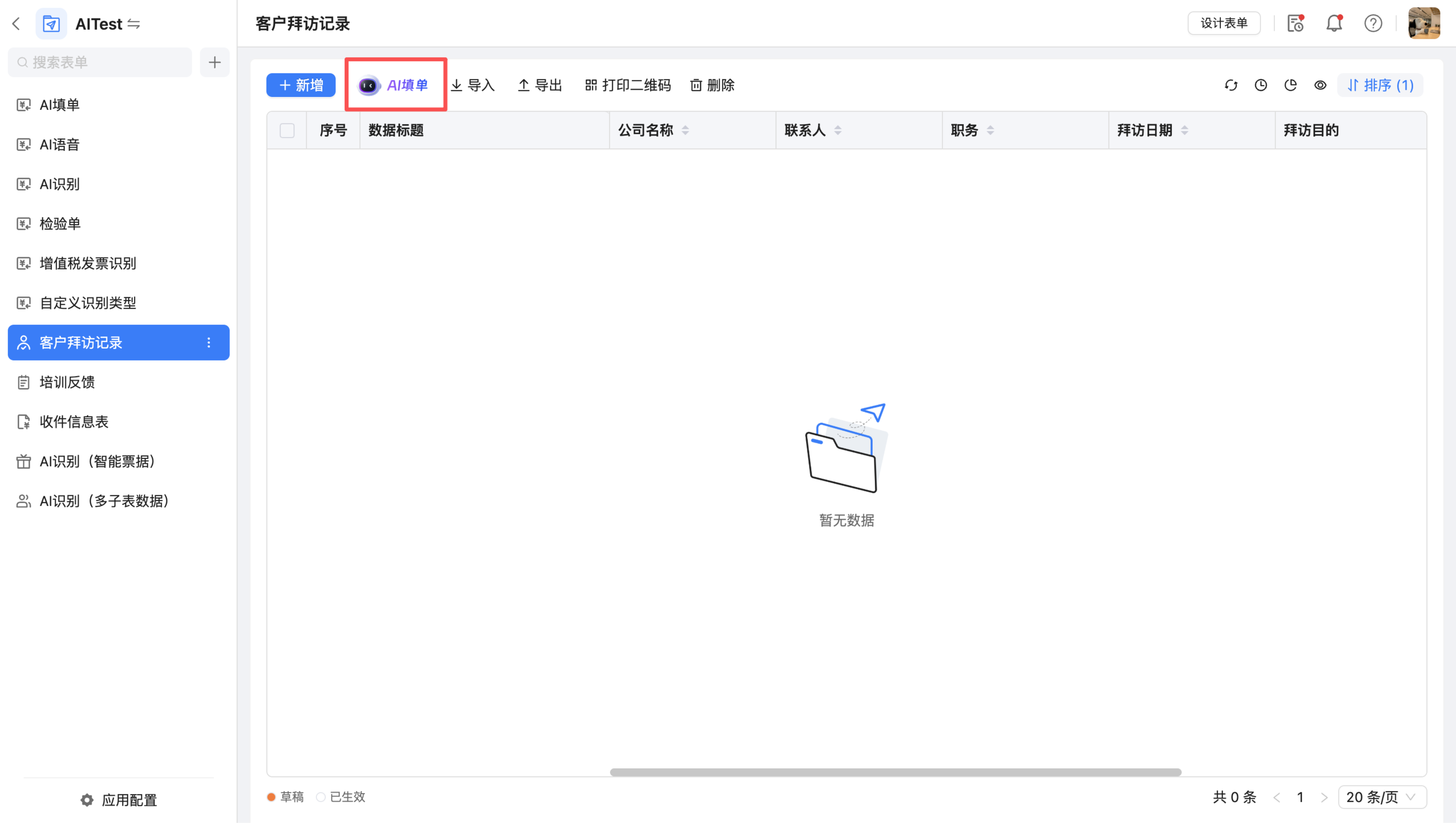开启“AI填单”后,若用户拥有新增表单的权限,则可见“AI填单”按钮