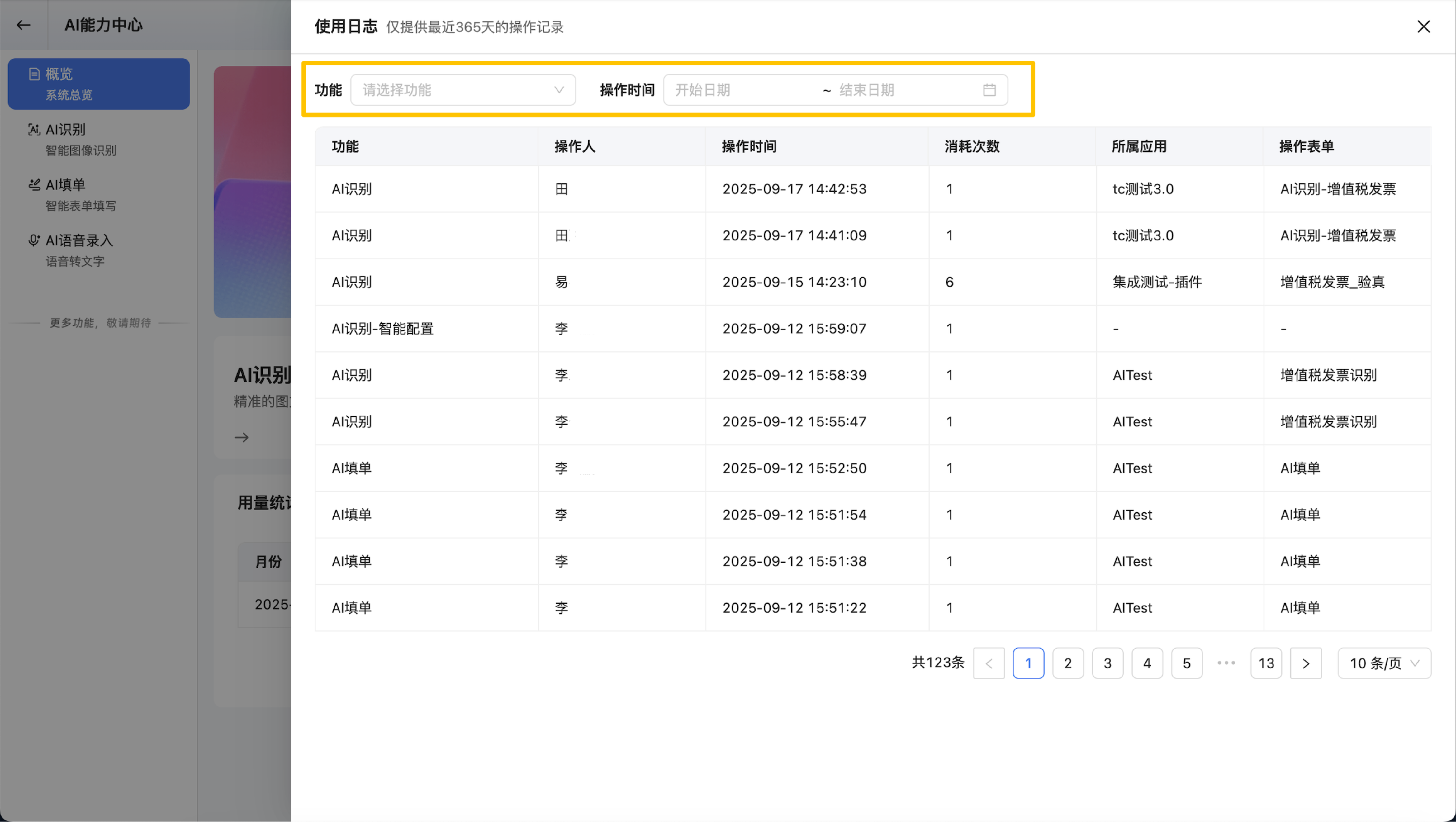 使用日志:记录了 AI 能力的使用明细,包含以下字段: