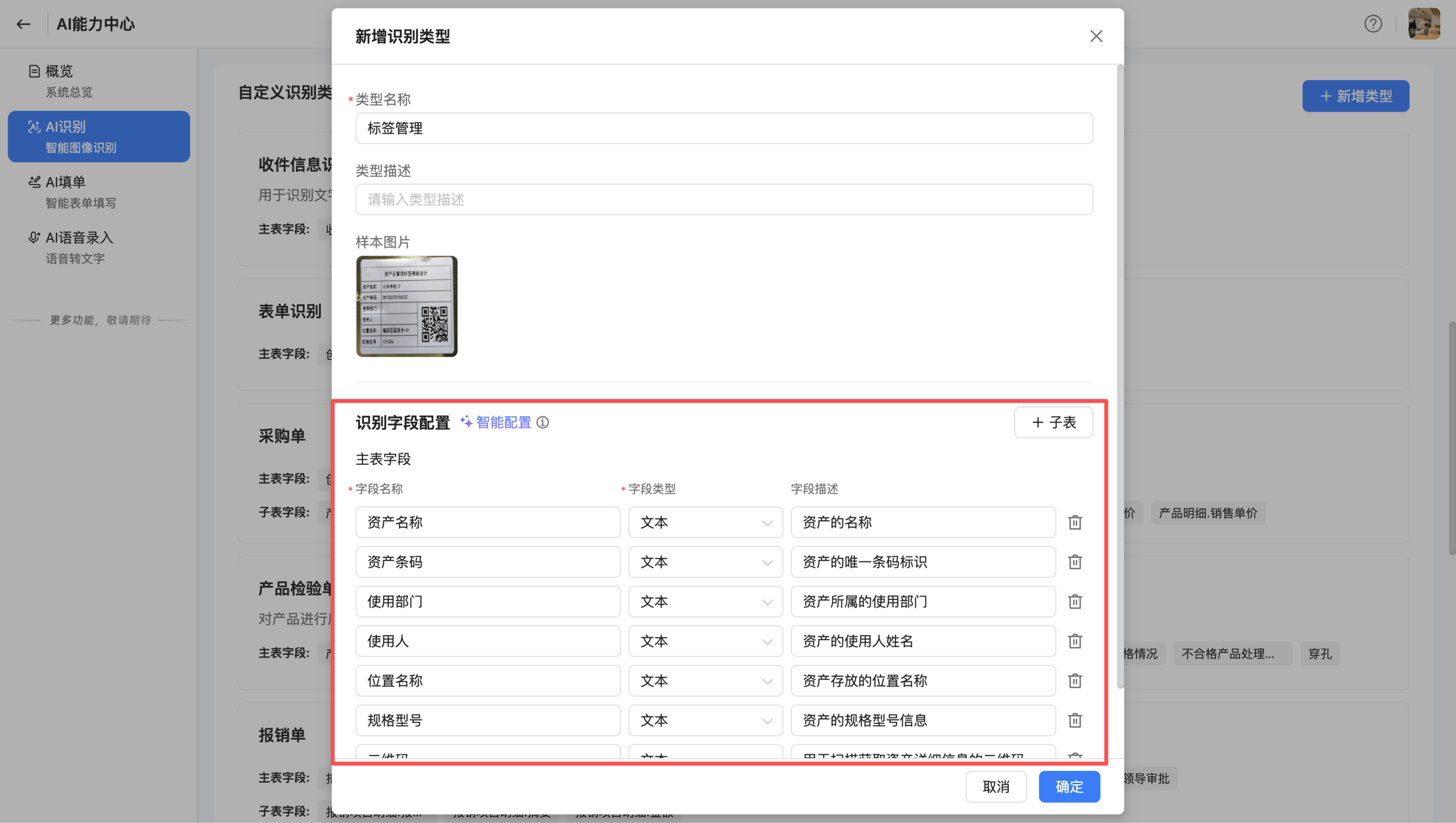 此外,上传样本图片后,可使用智能配置功能。AI会对上传的样本图片进行结构分析,自动生成字段信息(字段名称、字段类型、字段描述)。生成字段后,可手动调整配置。