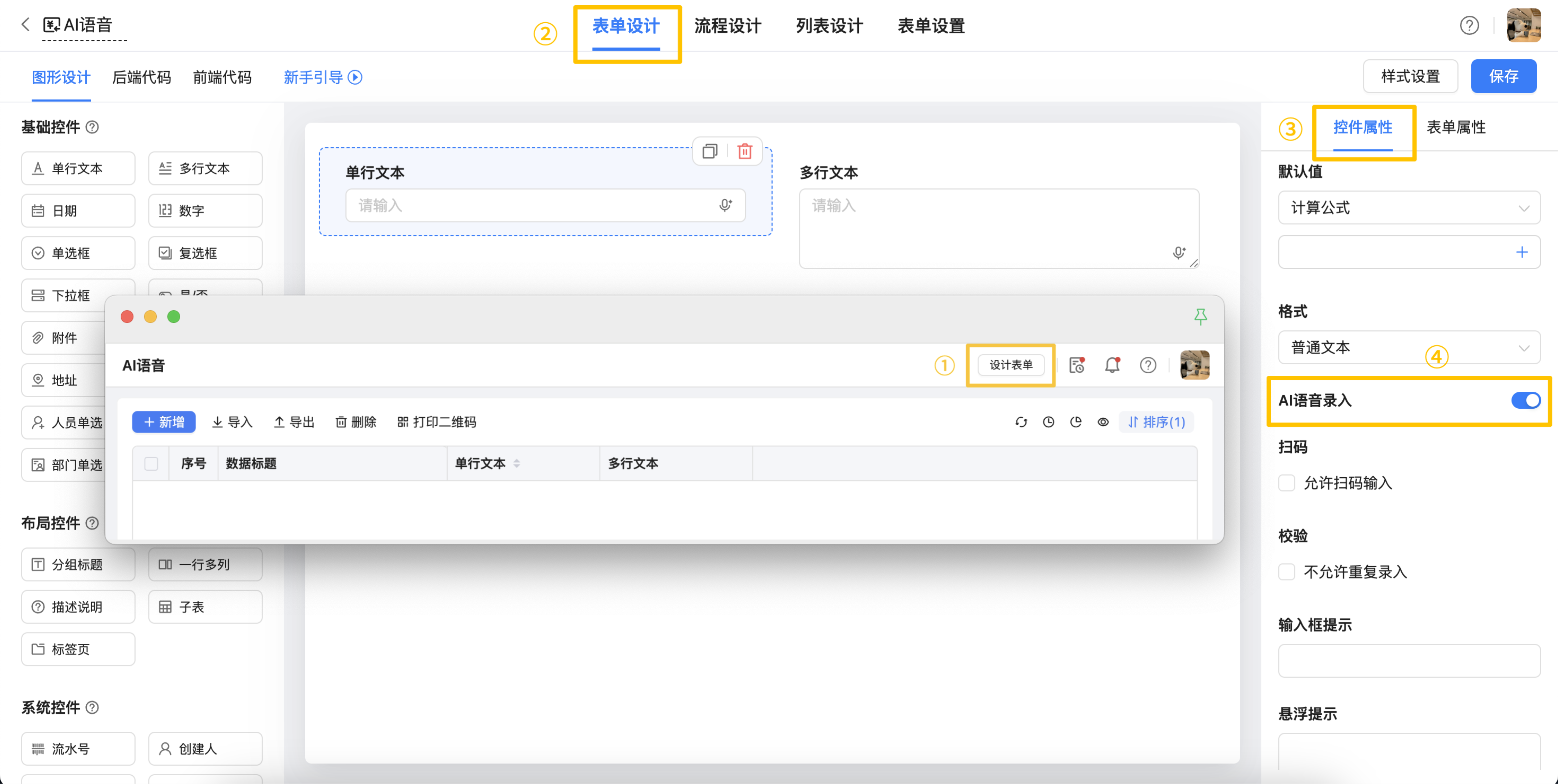 配置入口:设计表单>表单设计>控件属性>AI语音录入