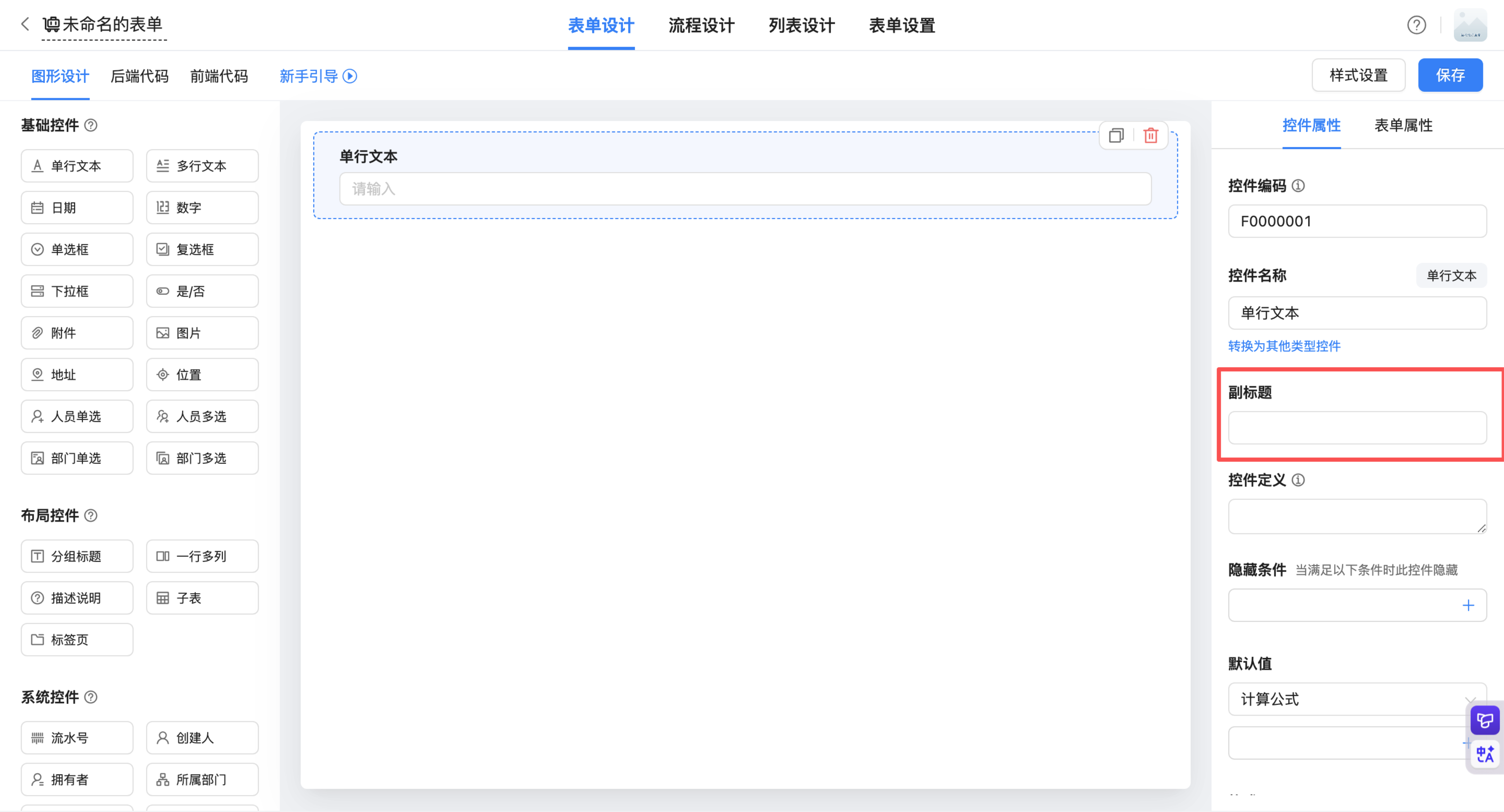功能入口:设计表单>表单设计>选择控件>控件属性>副标题