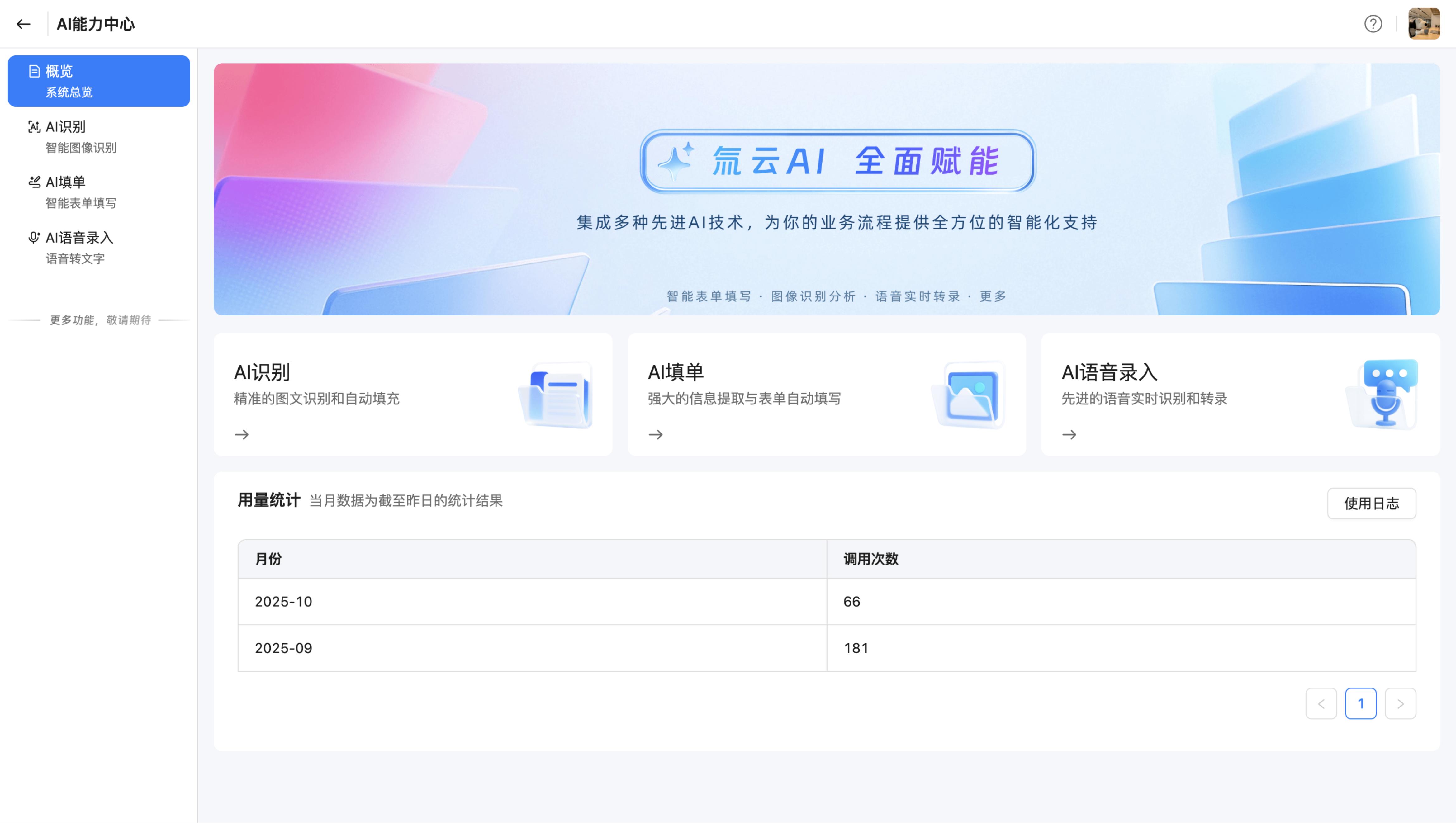 用量统计:按月展示本月使用的AI调用次数,当月数据为截至昨日的统计结果。