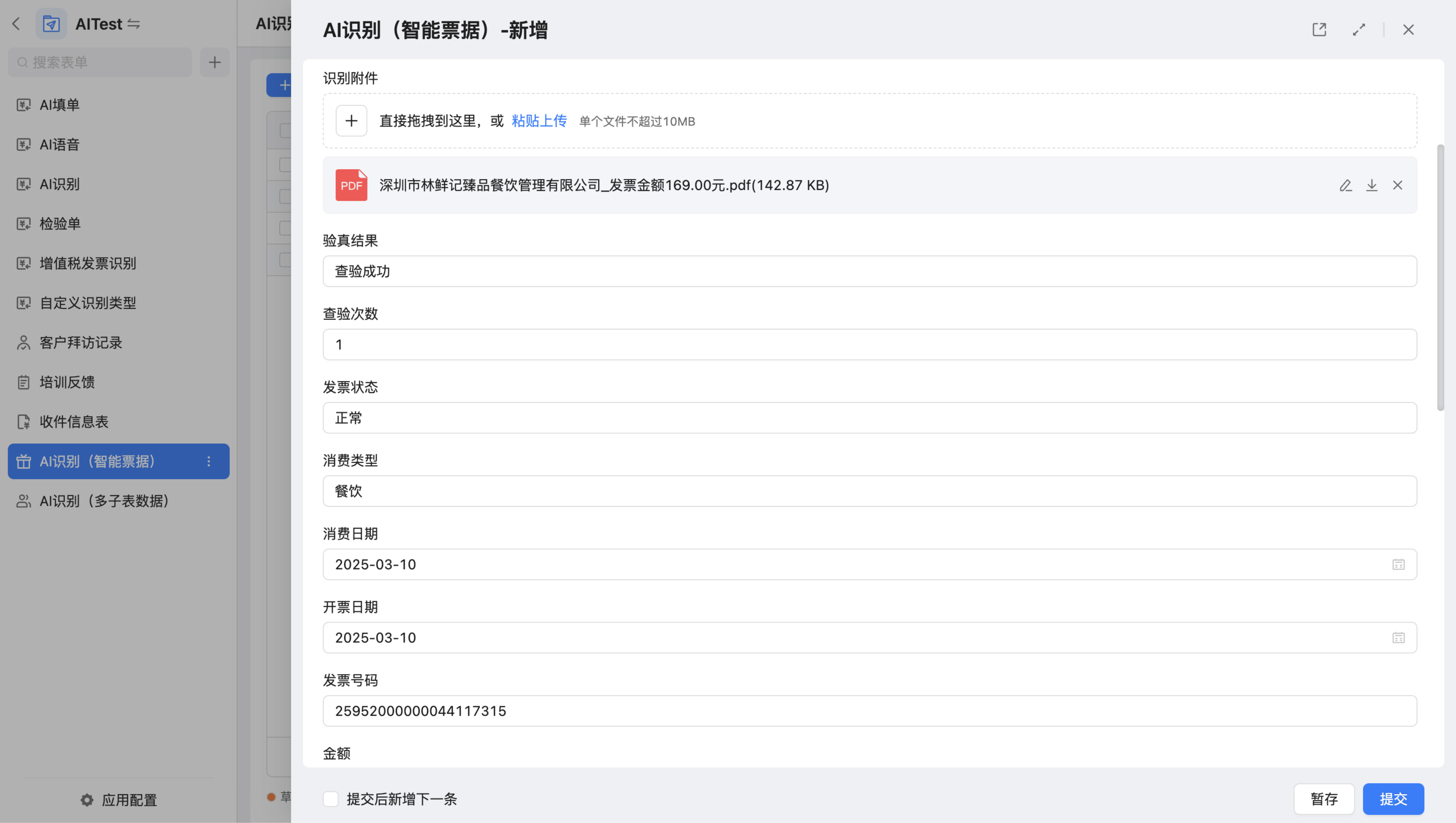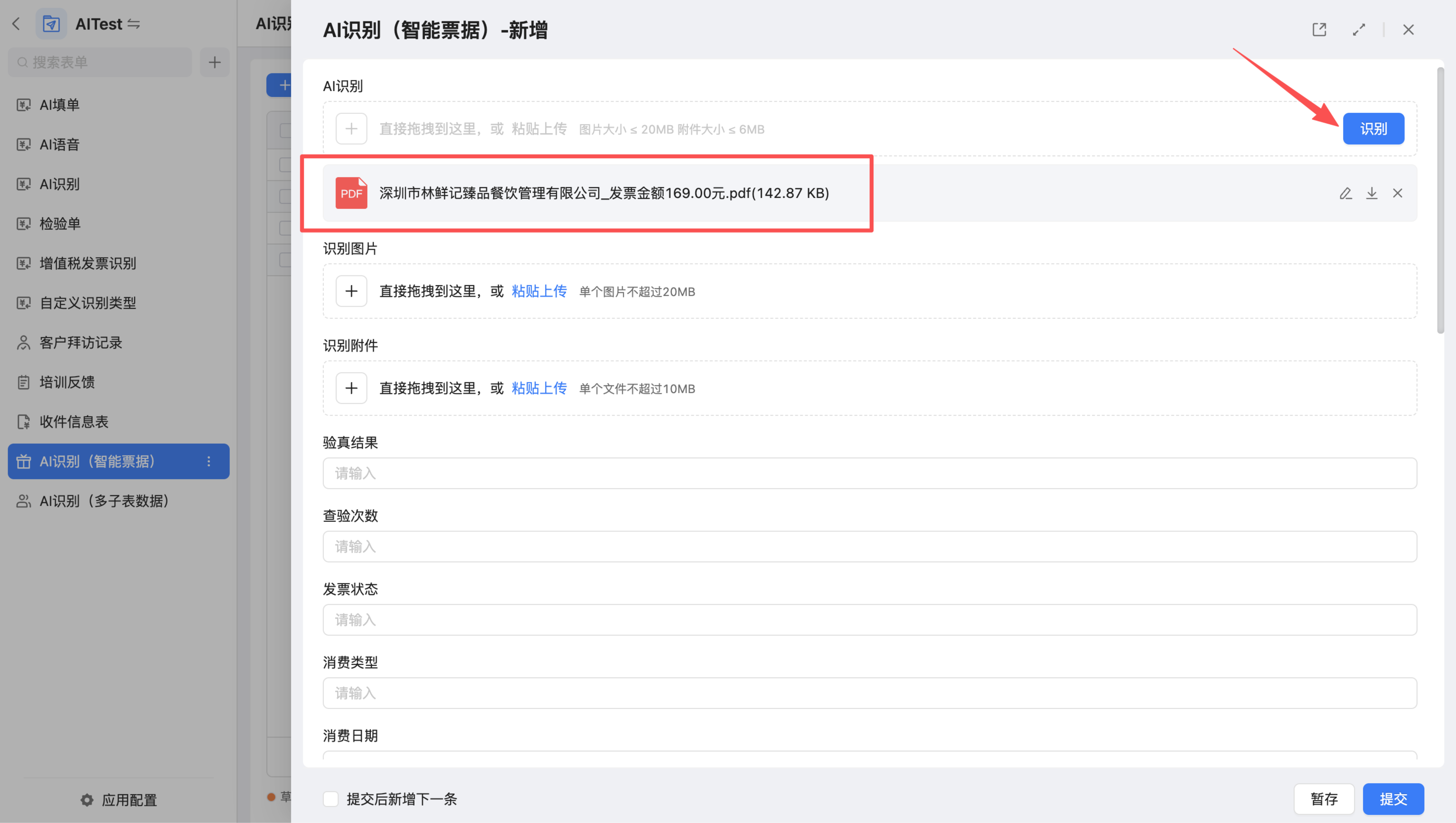 在新增表单时点击AI识别控件,上传需要识别的图片或附件,点击“识别”,系统则会自动识别内容并填入表单。